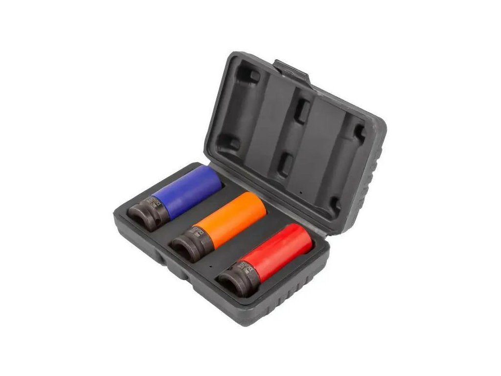 Set de capete subțiri de șurubelniță cu percuție 1/2'' (17, 19 și 21 mm) este un instrument fiabil creat pentru a lucra cu jante din aluminiu și aliaje ușoare, unde este necesară siguranța și precizia maximă. Datorită construcției subțiri și capacului de protecție, capetele permit accesul la șuruburi și piulițe plasate în adâncimi, protejând totodată suprafața jantelor de zgârieturi.