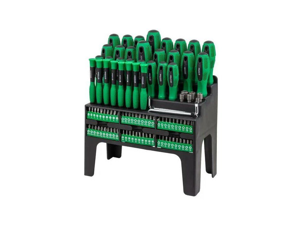 Setul conține șurubelnițe plate, cruce, Torx, pătrate și o selecție variată de biți și capete de prindere. Datorită acestui fapt, setul acoperă aproape toate tipurile de șuruburi și piulițe cele mai frecvent întâlnite.