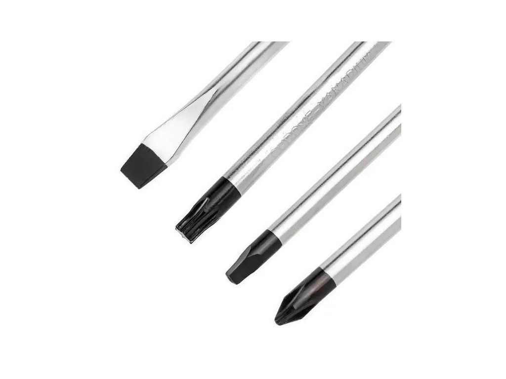 Părțile de bază ale șurubelnițelor și biții sunt fabricate din oțel crom-vanadiu călit (Cr-V), care se caracterizează prin rezistență la uzură și deformații. Acest material garantează o durată lungă de viață a uneltelor chiar și în condiții de utilizare intensă.