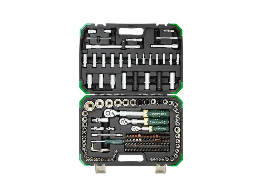 Setul include trei sisteme de prindere de bază – 1/4", 3/8" și 1/2", care permit lucrul cu o gamă largă de șuruburi, piulițe și alte elemente de fixare. Toate uneltele sunt fabricate din oțel crom-vanadiu de înaltă calitate (Cr-V), ceea ce le conferă o rezistență excepțională la uzură, coroziune și sarcini dinamice.