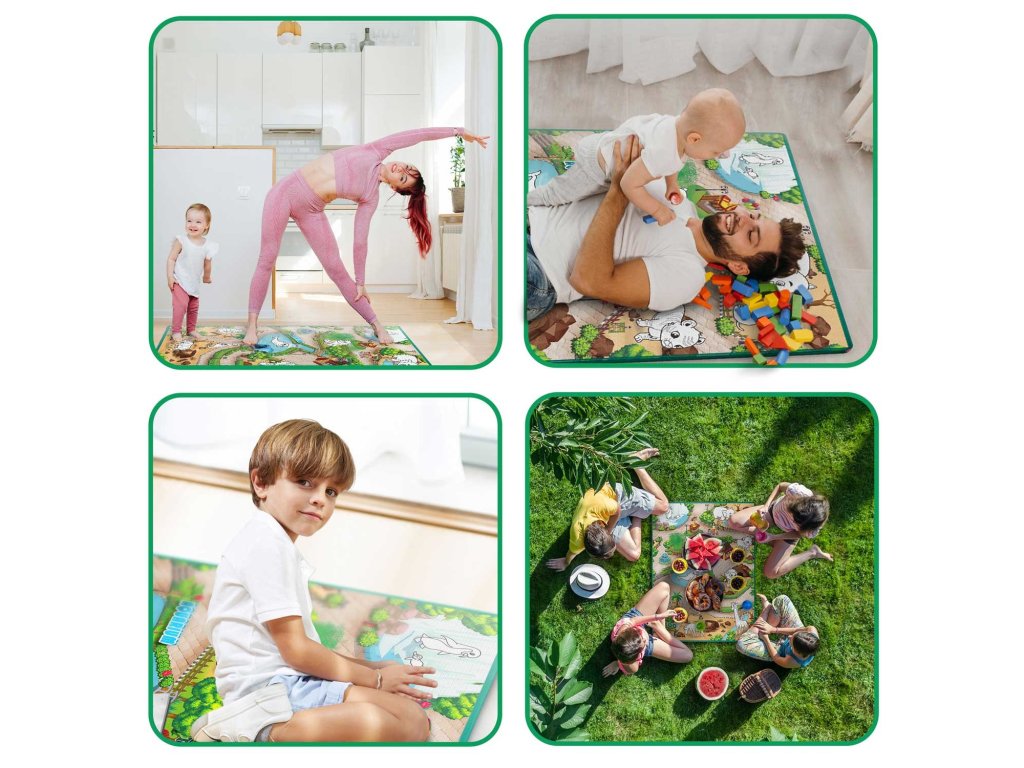 - pentru picnicuri, pentru exerciții comune,pentru a juca cu elemente de prezentare amplasate pe covoraș și multe alte jocuri,