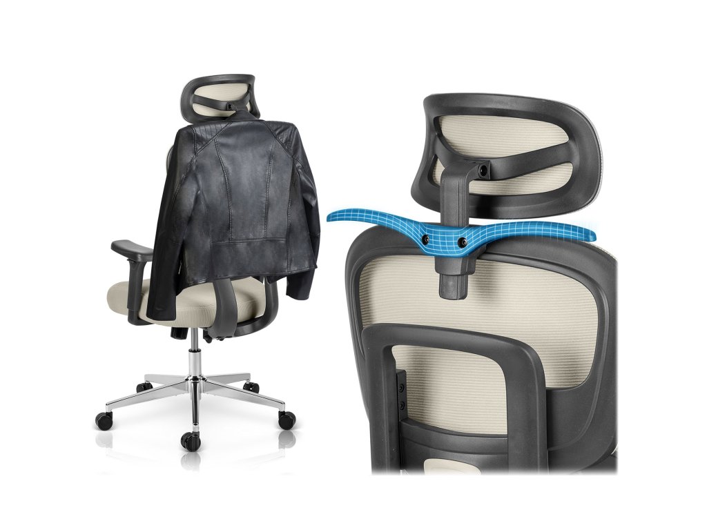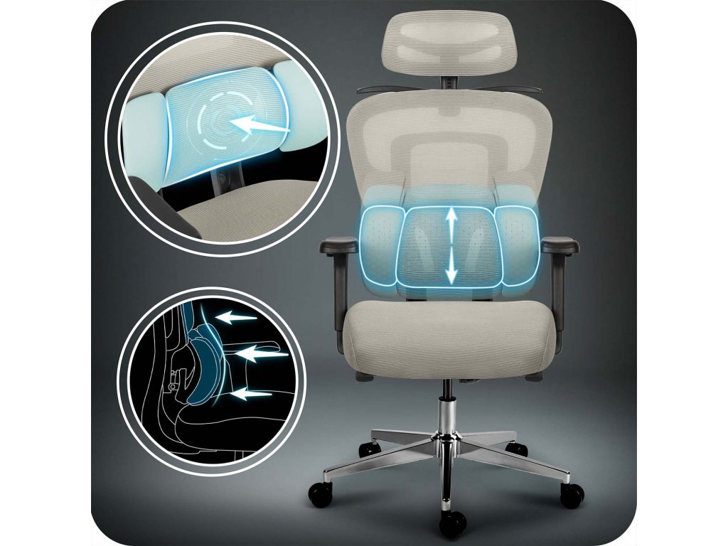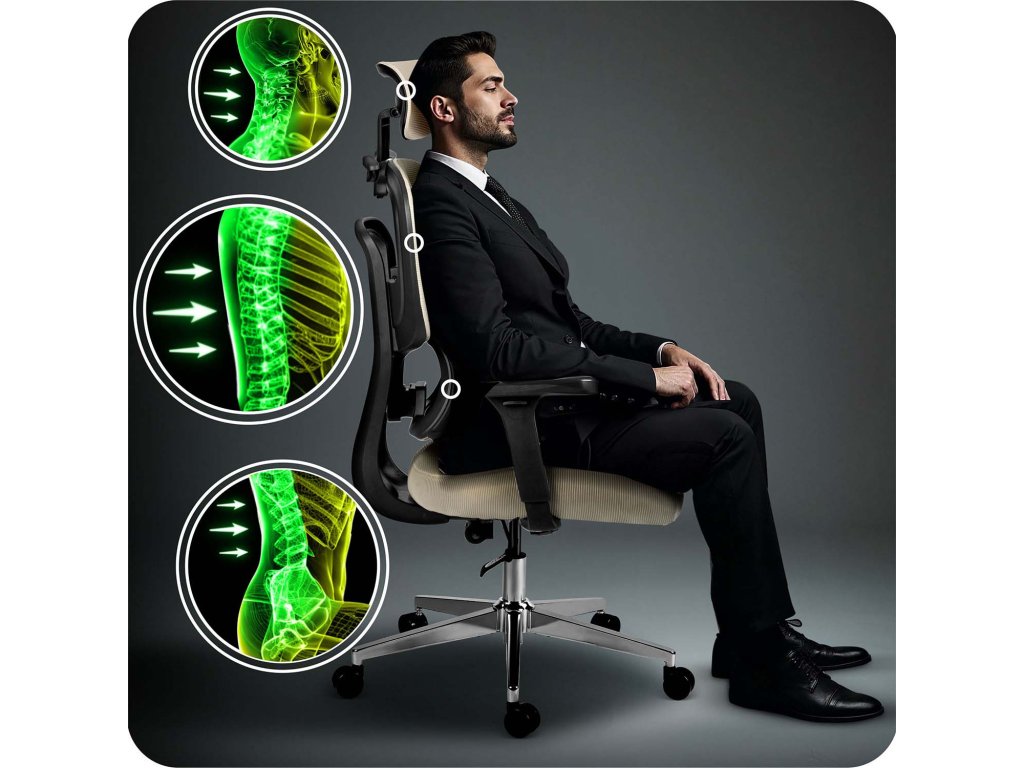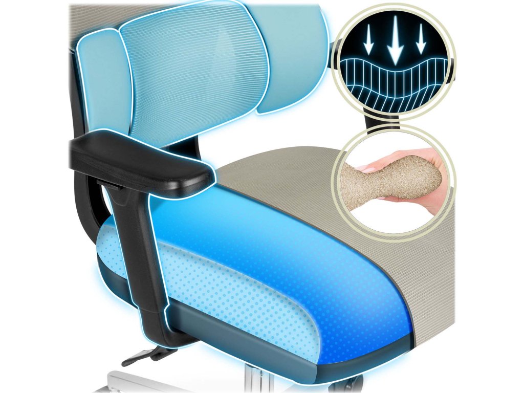 - Umplutura ergonomică se potrivește perfect corpului, distribuind uniform presiunea și reducând tensiunea pe parcursul întregii zile.