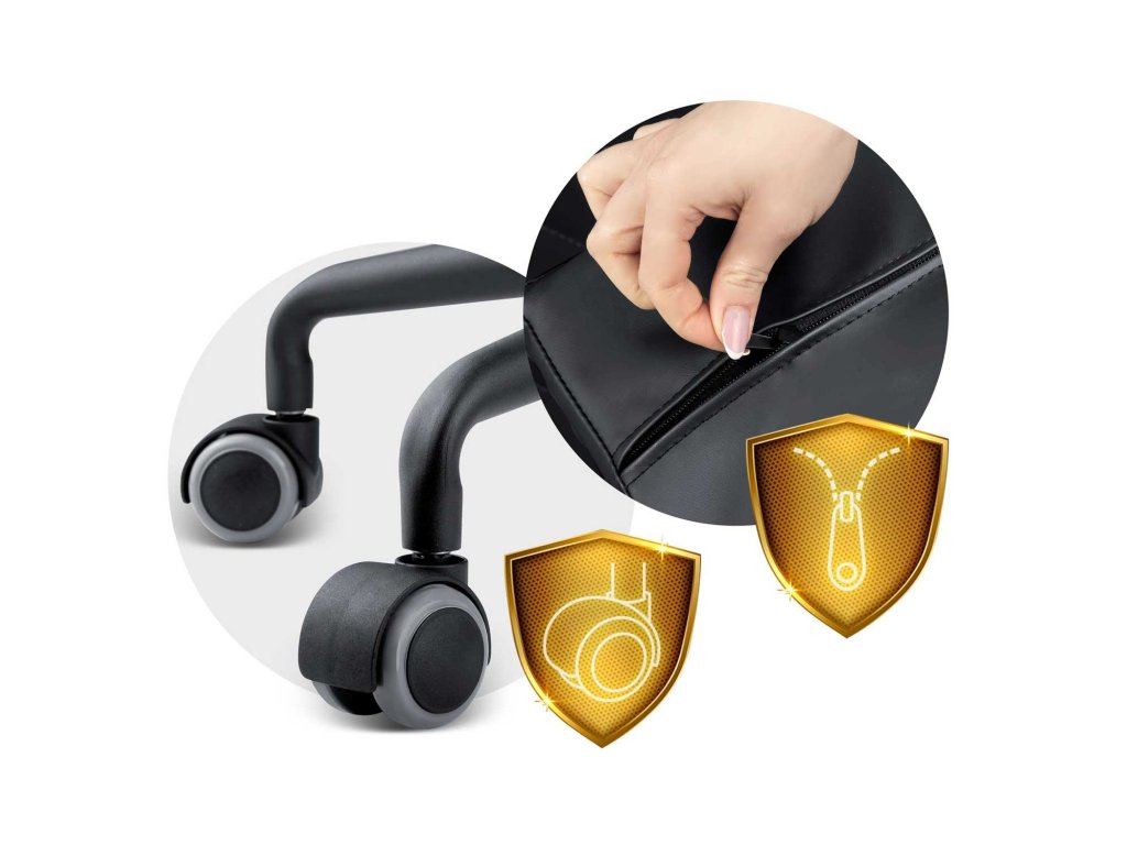 Pernele pot fi scoase din husă datorită fermoarului cusut, iar baza metalică robustă este echipată cu roți din nylon și cauciuc, ce se mișcă silențios și nu zgârie podeaua.