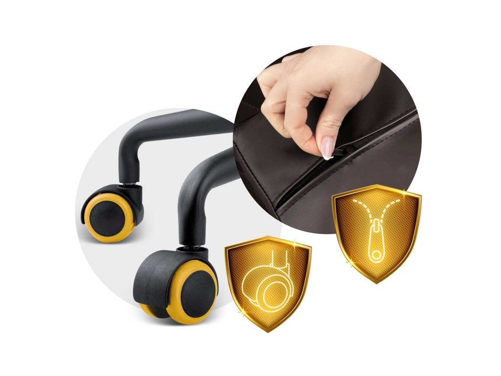 Pernele pot fi scoase din husă datorită fermoarului încorporat și baza metalică solidă este echipată cu roți din cauciuc-nylon , care se mișcă silențios și nu zgârie podeaua.