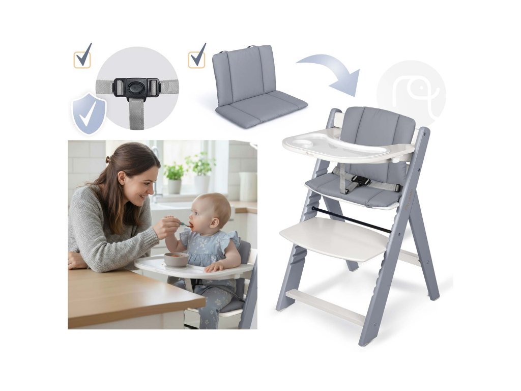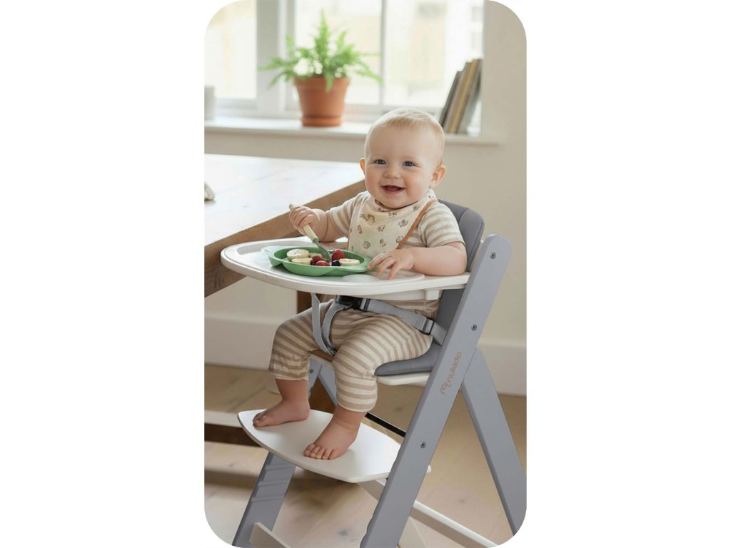 Datorită setului special cu centuri de siguranță și perniței confortabile, devine un prim scaun sigur și confortabil pentru micuțul tău. Ideal pentru primele mese și momentele petrecute împreună la masă.