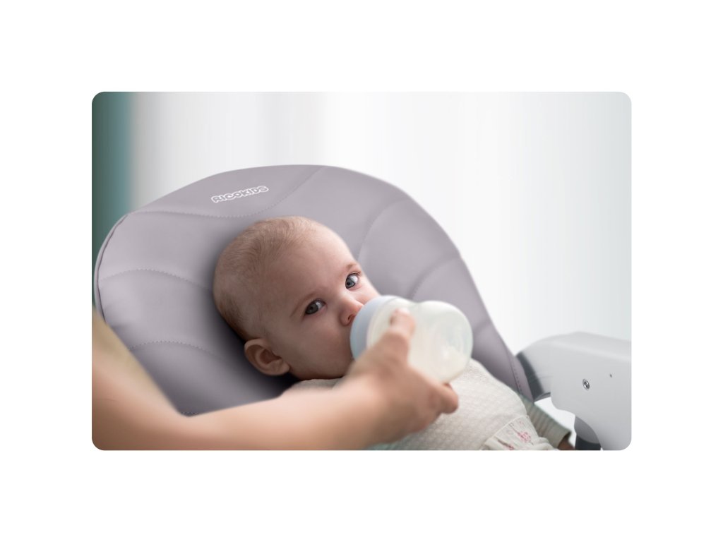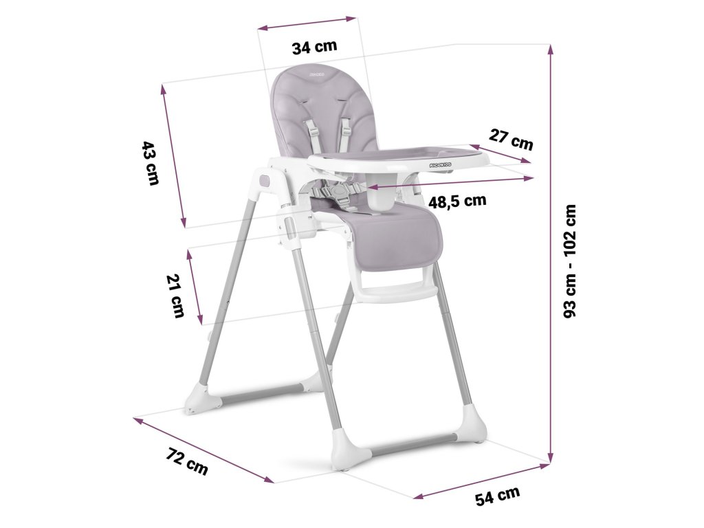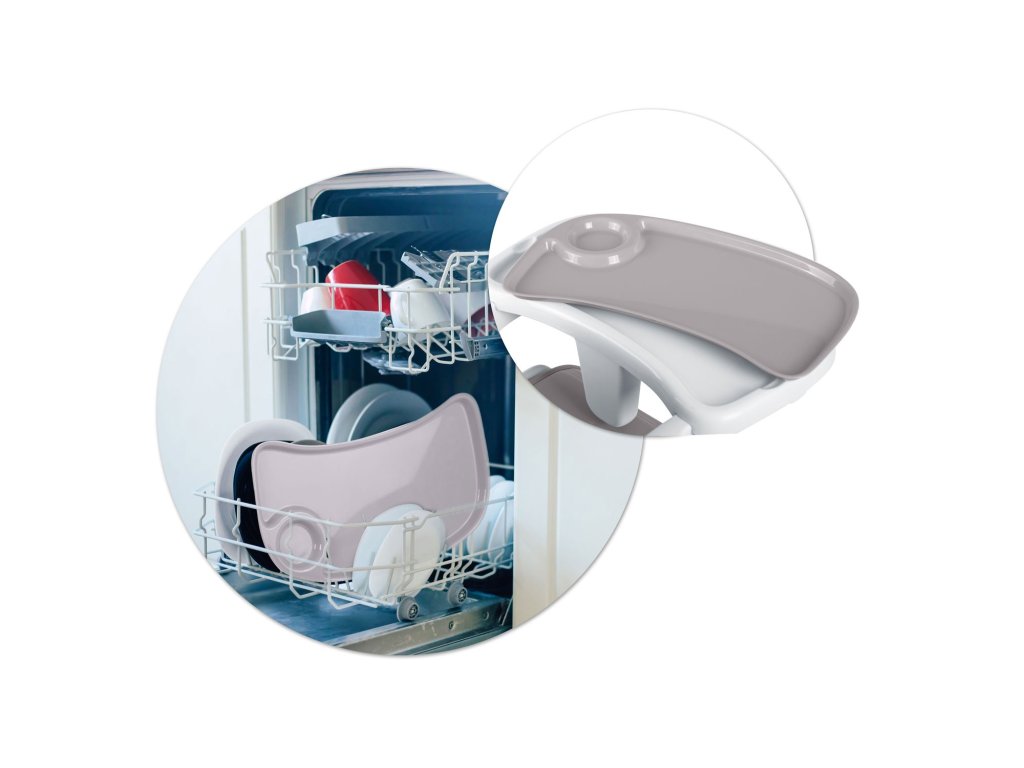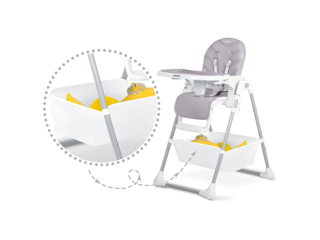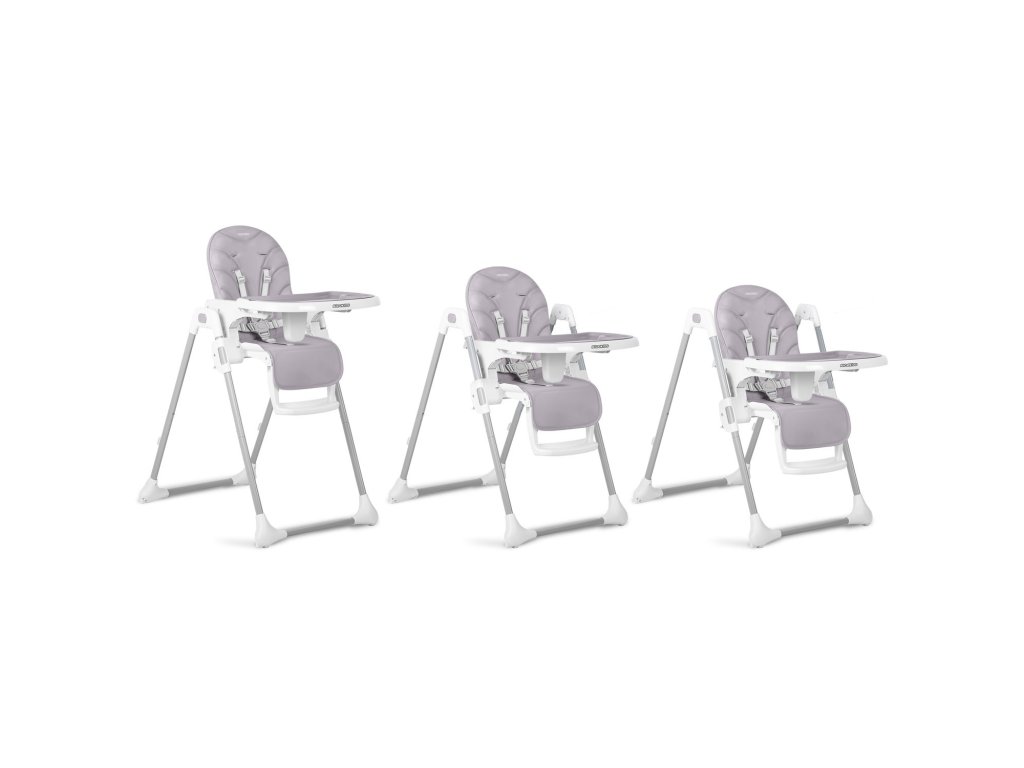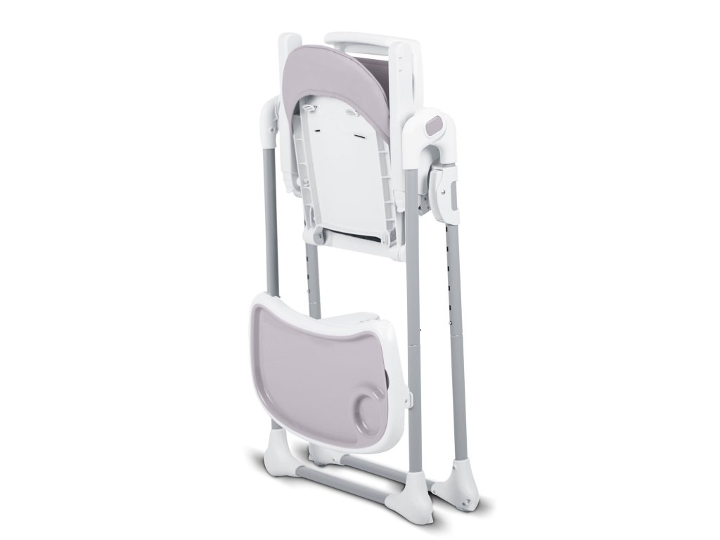 Scaunul înalt permite reglarea distanței tăvii față de copil. Poate fi de asemenea demontat complet oricând.