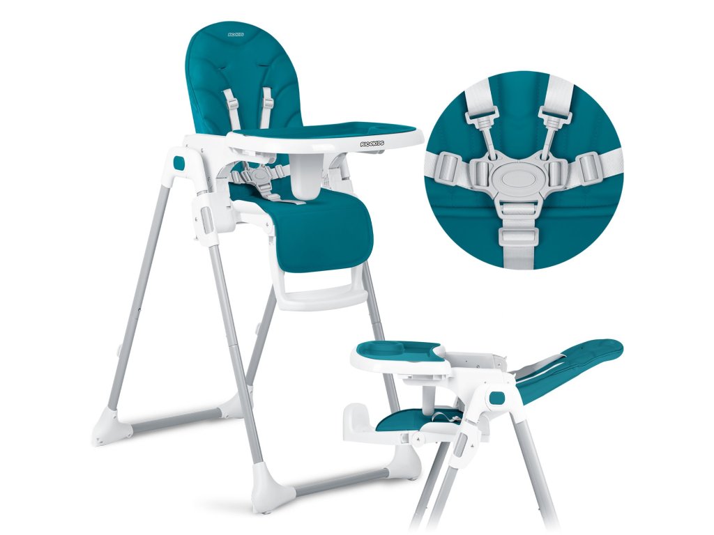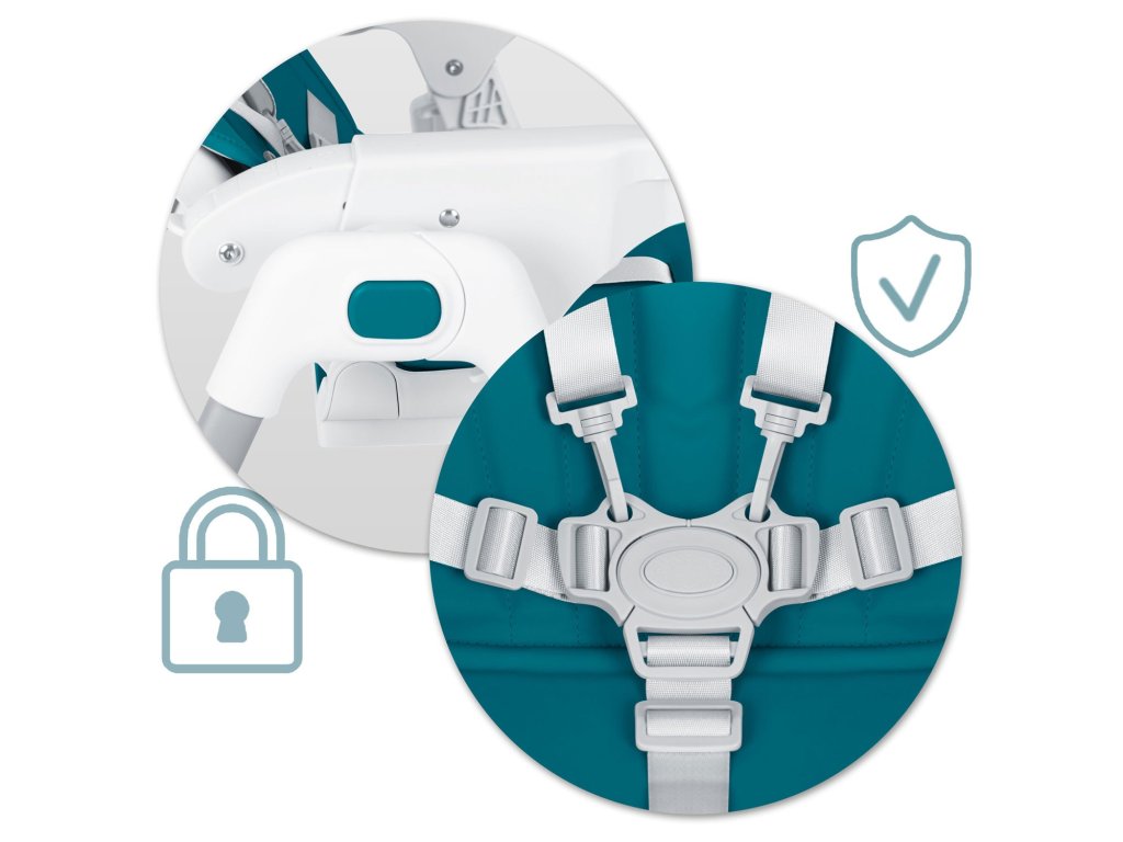 Fiabile și testate centurile de siguranță în cinci puncte asigură faptul că copilul nu va putea părăsi scaunul singur și risca să cadă.