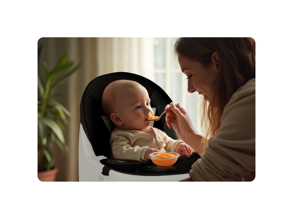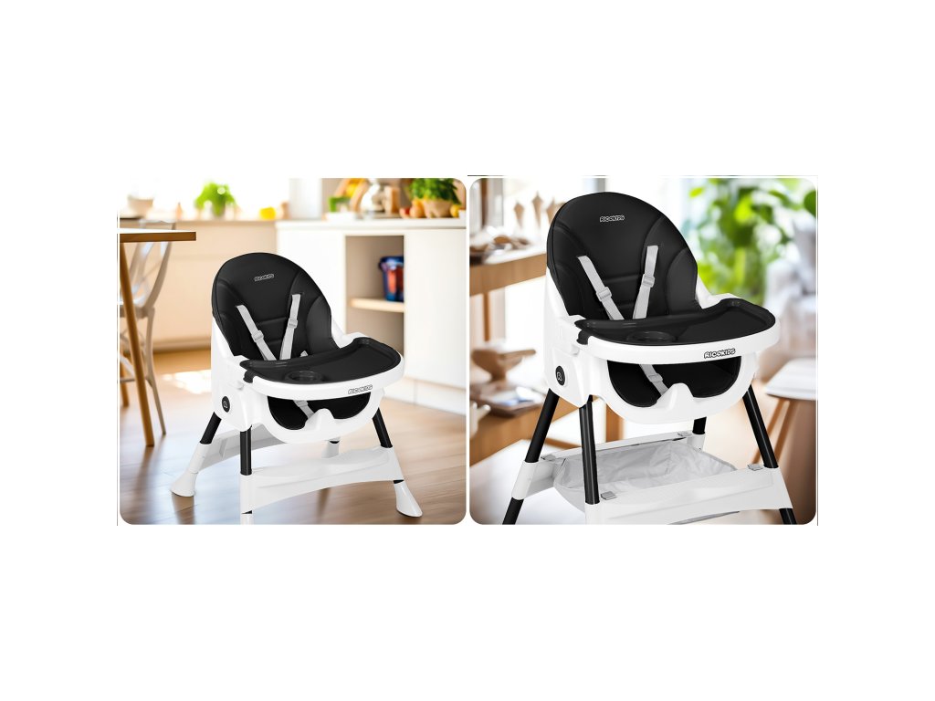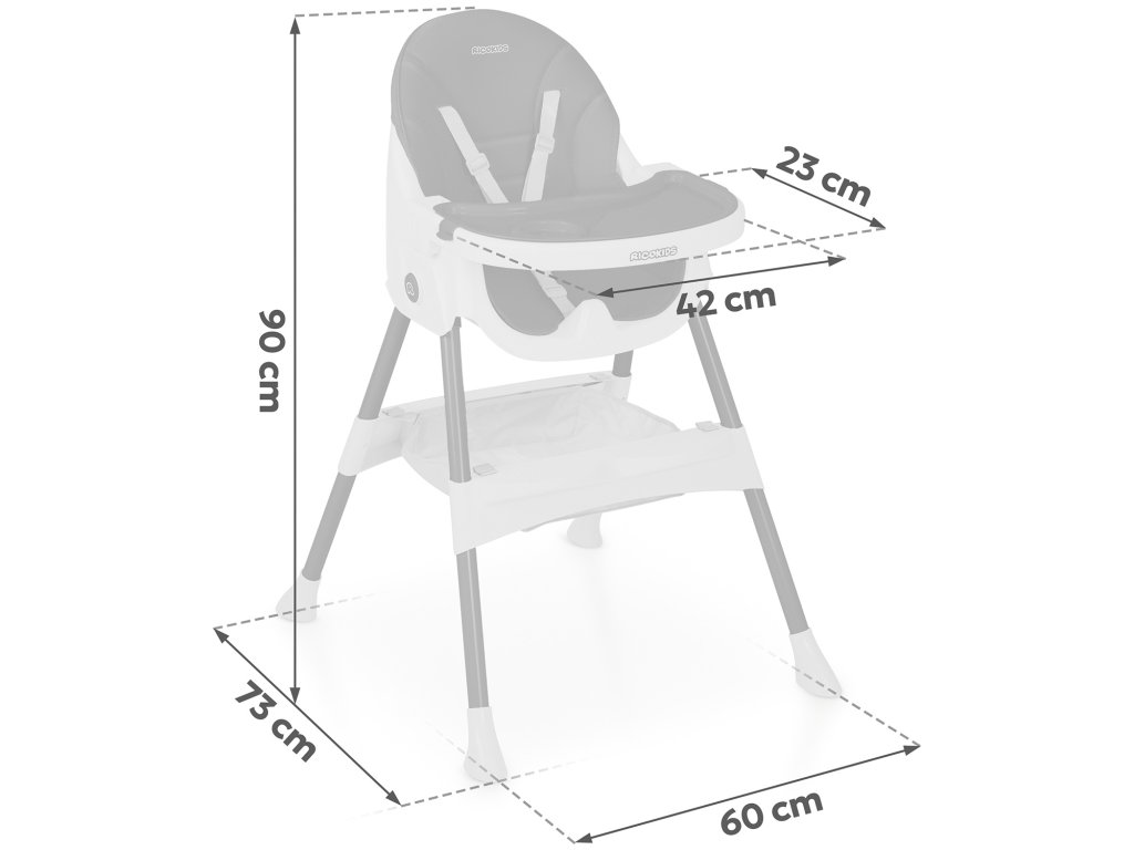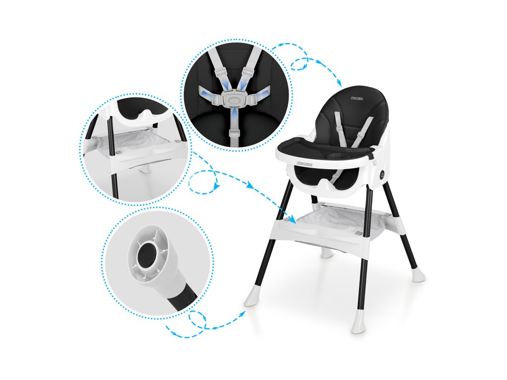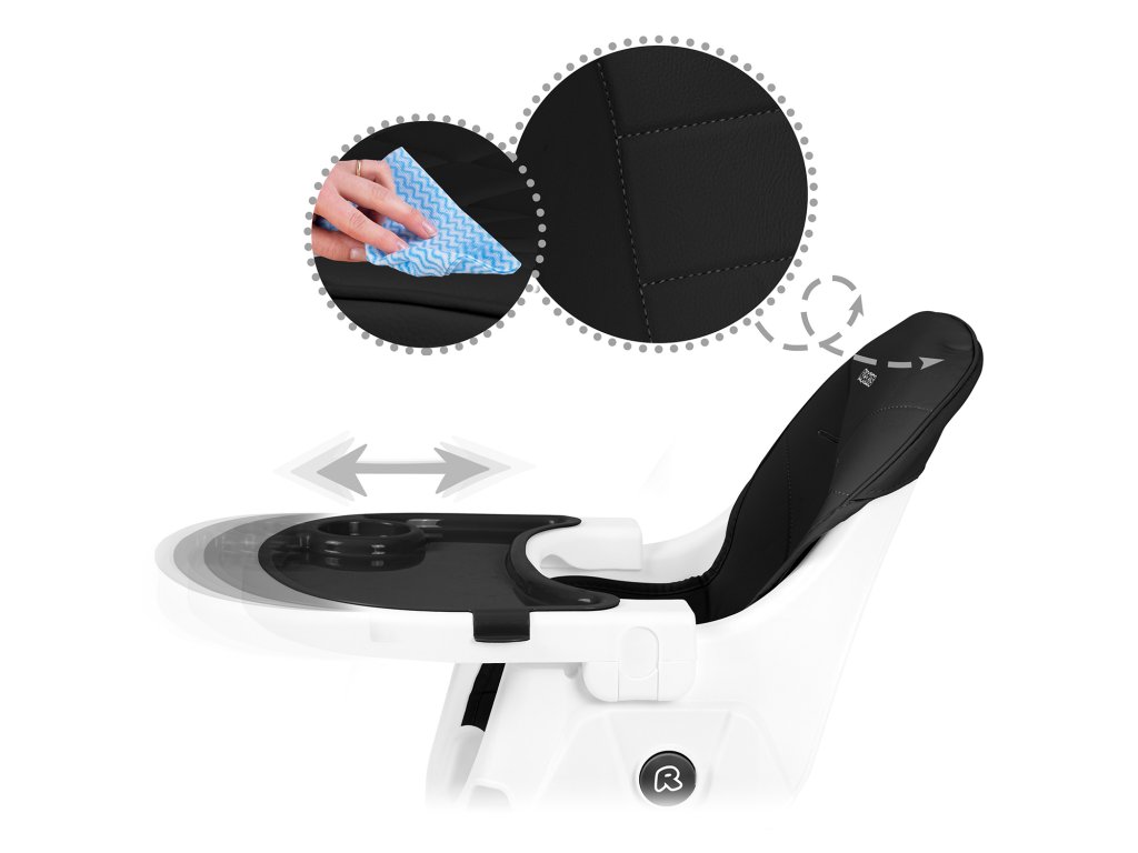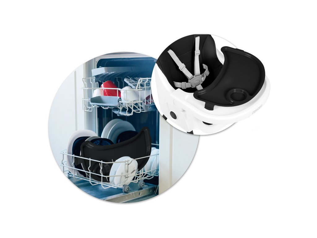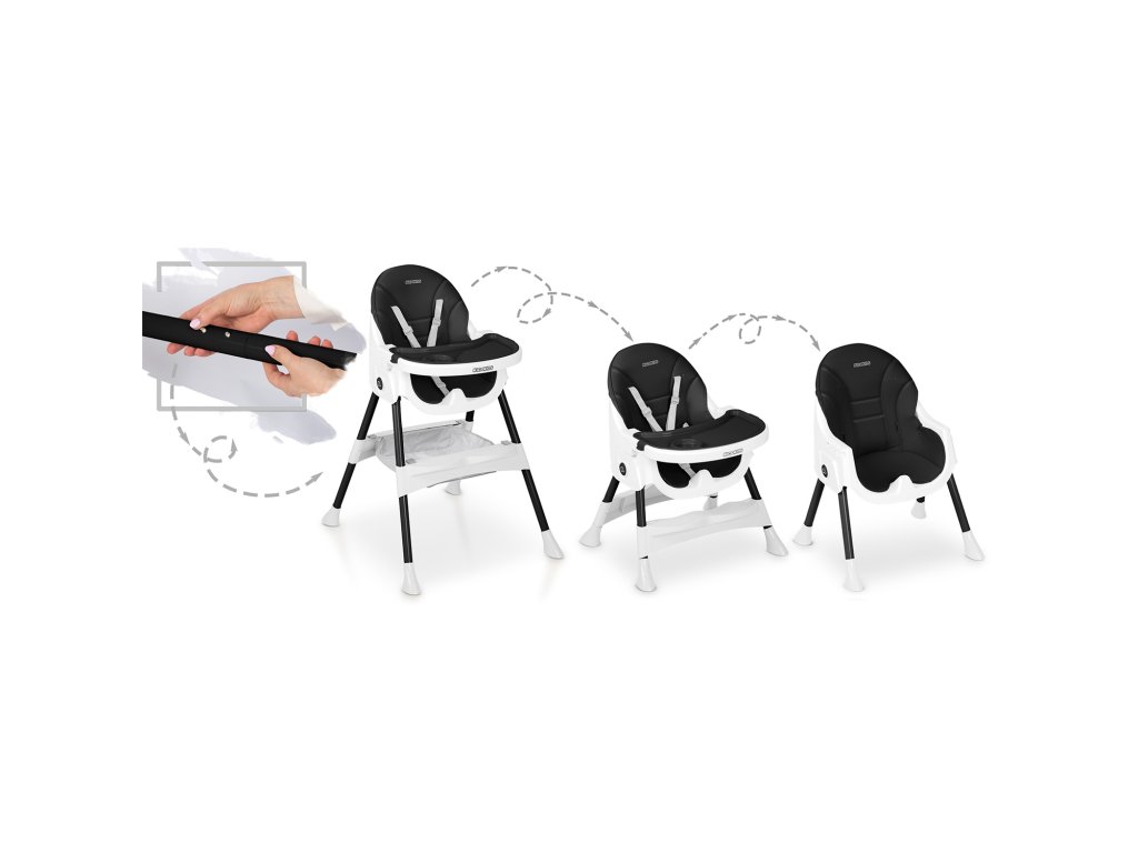 Scaunul oferă posibilitatea de a regla liber distanța tăviței față de copil. Poate fi de asemenea demontat complet oricând.