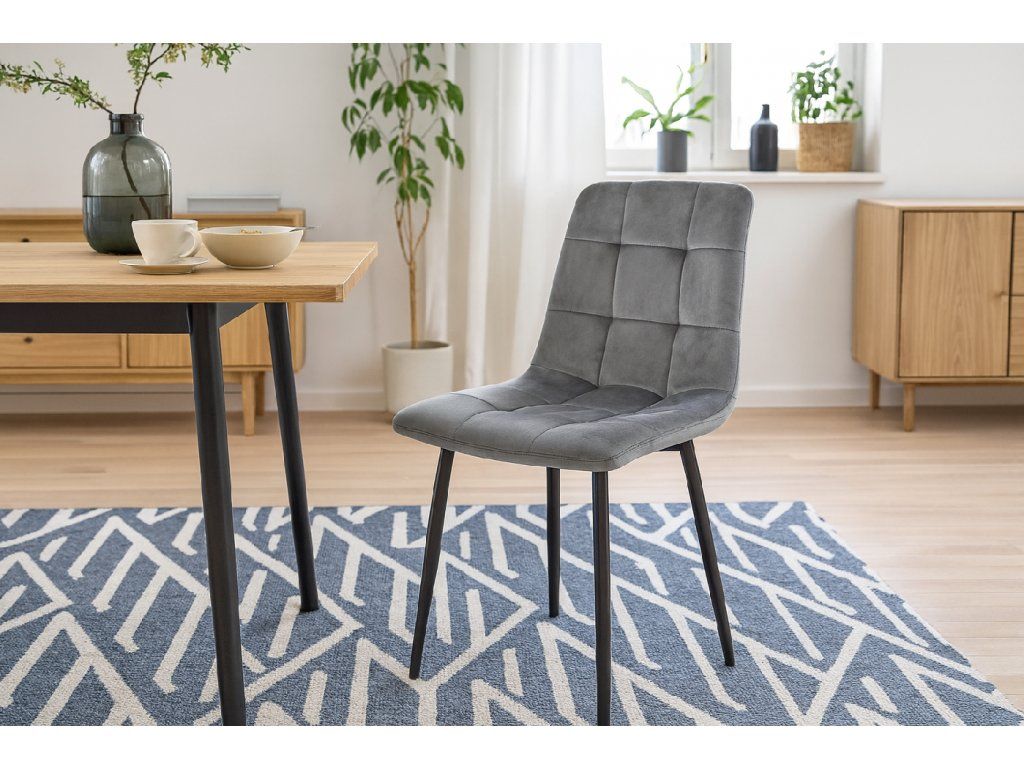 Scaunul modern din catifea de culoare gri este o combinație de eleganță și confort. Spătarul quilted, tapițeria moale și construcția solidă îl fac un accesoriu ideal pentru living, dining sau birou, adăugând stil și căldură interiorului.