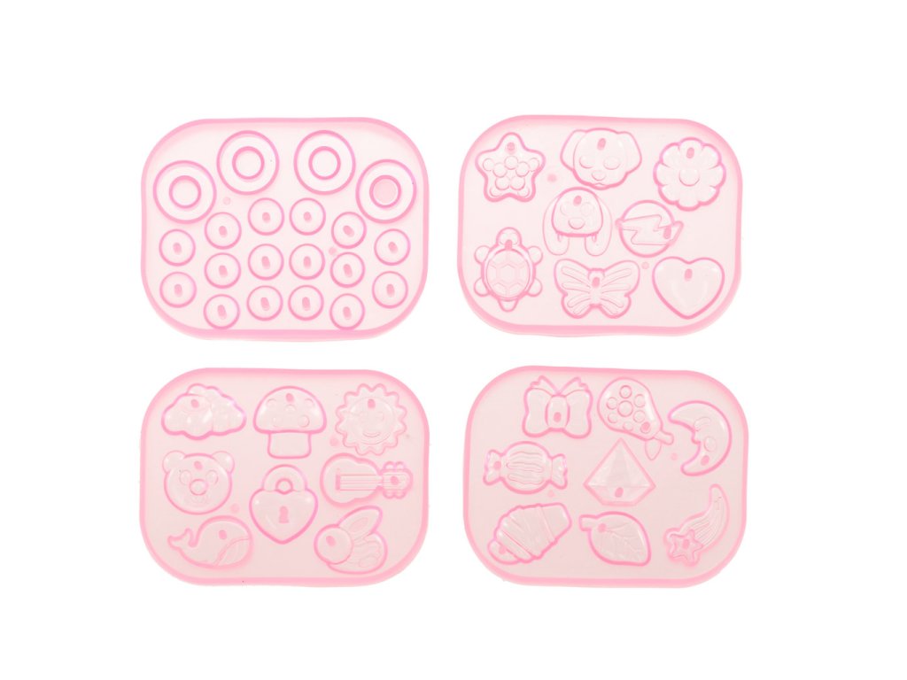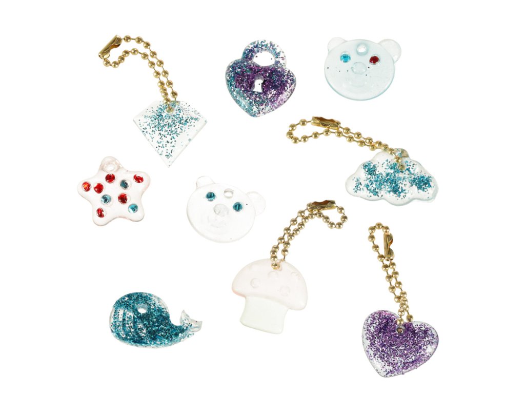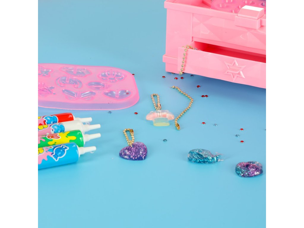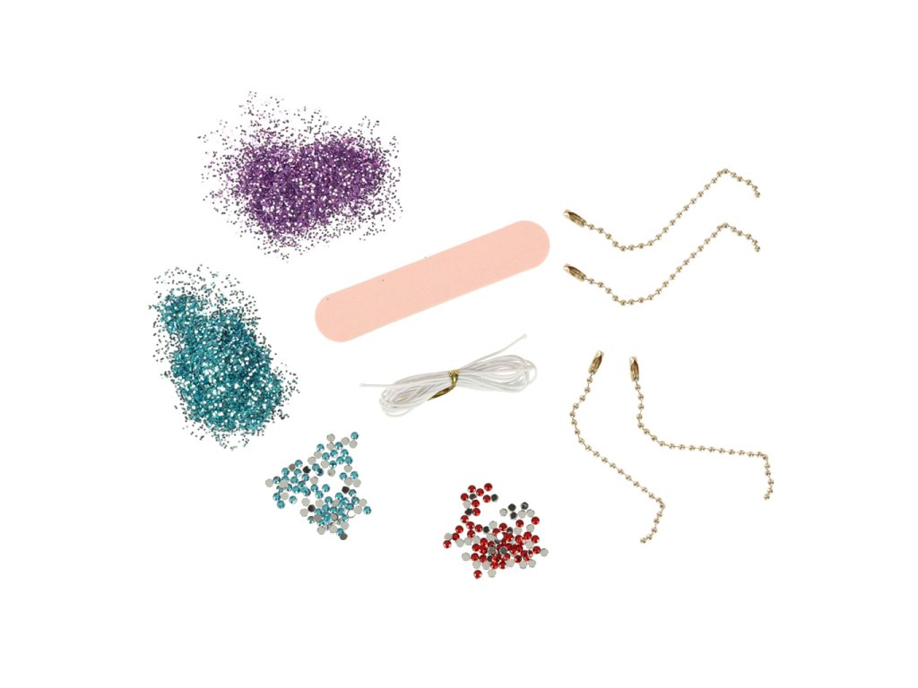 Setul conține patru tuburi de lipici în culorile roșu, verde, albastru și alb, precum și patru forme cu diferite forme. Alteelemente decorative, cum ar fi sclipici și mici cristale, permit decorarea bijuteriilor în mod individual. Munca este ușurată de accesorii precum pilă și pensetă.