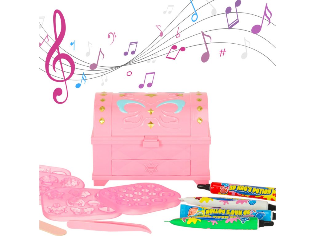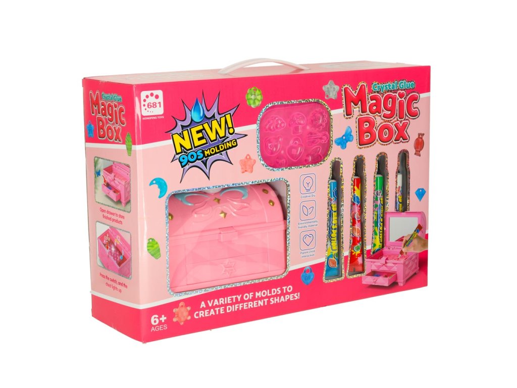 "Magic Box" este un set de creație care permite copilului să își creeze propriile bijuterii din lipici colorat, dezvoltându-i abilitățile manuale, creativitatea și simțul esteticii.