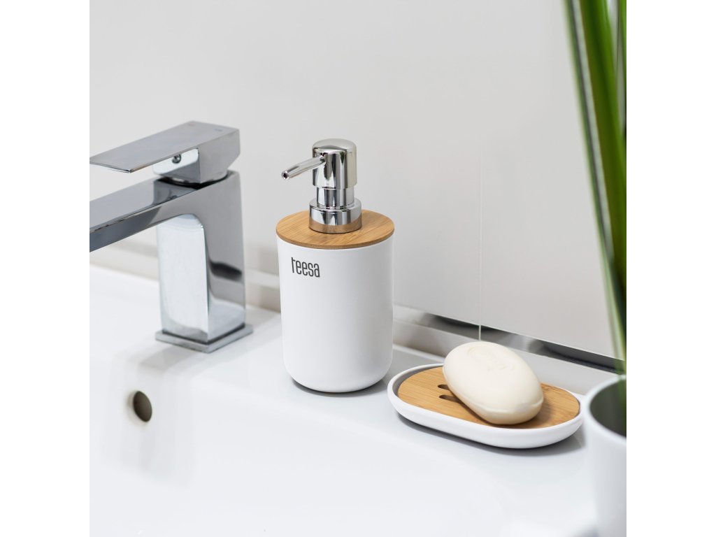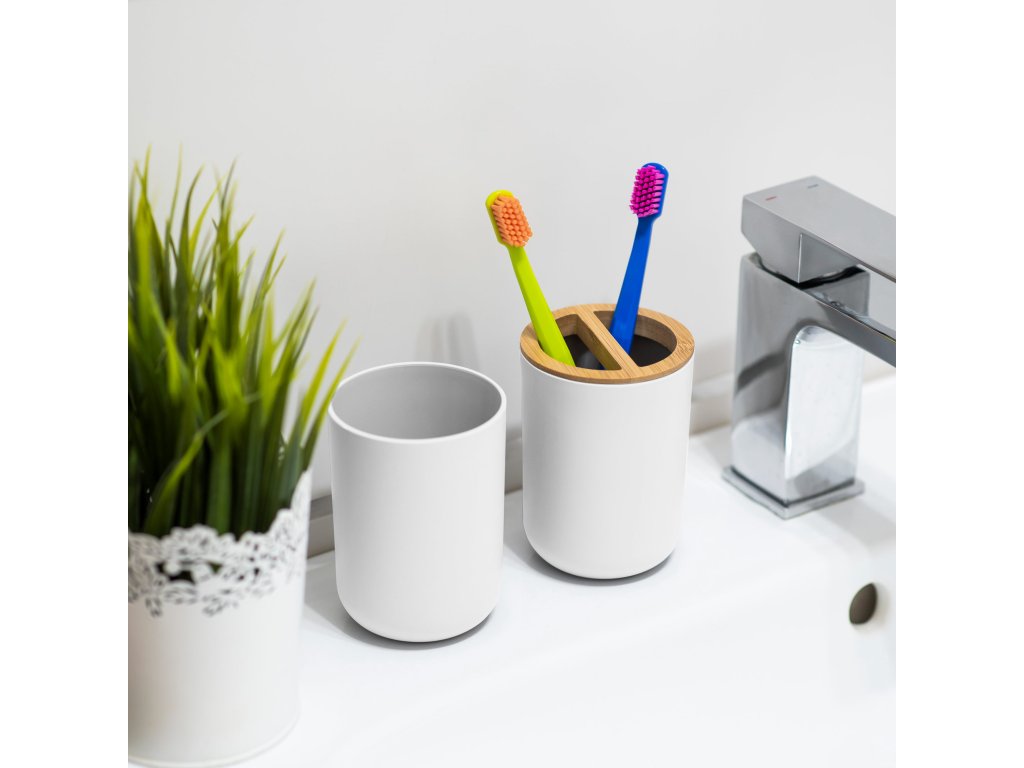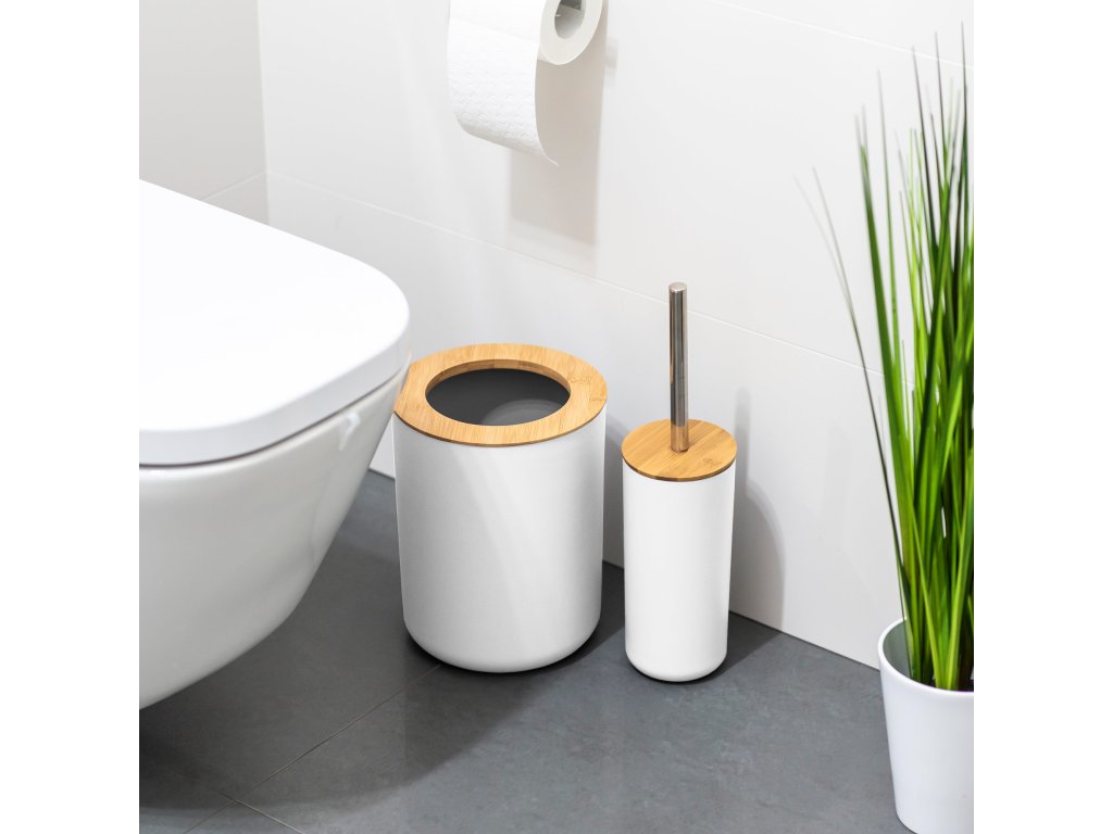 Include accesorii de baie, cum ar fi un suport pentru săpun, un dozator de săpun, un pahar, un suport pentru periuța de dinți, precum și o perie WC și un coș de gunoi. Toate accesoriile de baie sunt fabricate din plastic de înaltă calitate cu adaos de lemn de bambus.