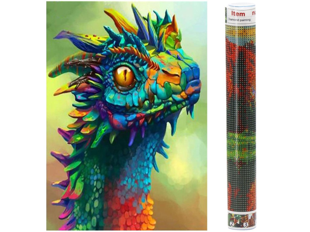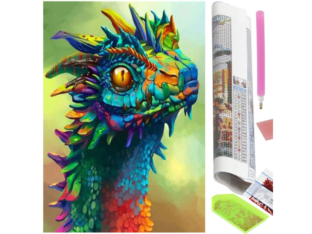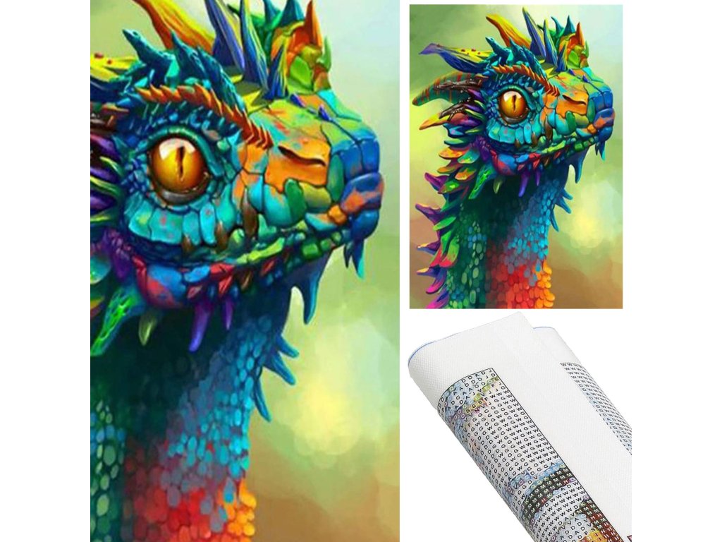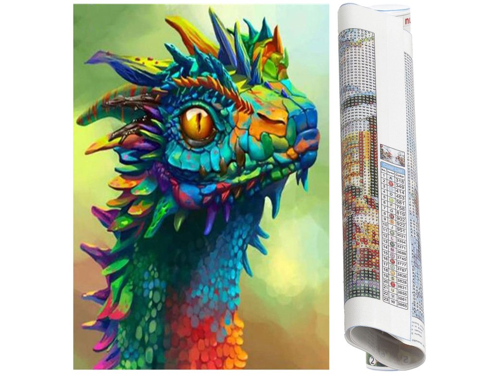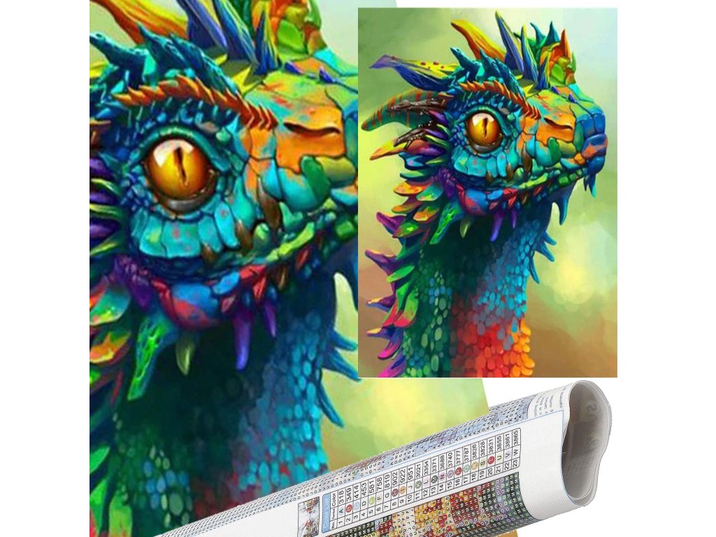 1x pânză robustă cu imagine imprimată, afișând capul dragonului și un index care asociază literele cu culorile și culorile cu numere ce determină culoarea diamantului