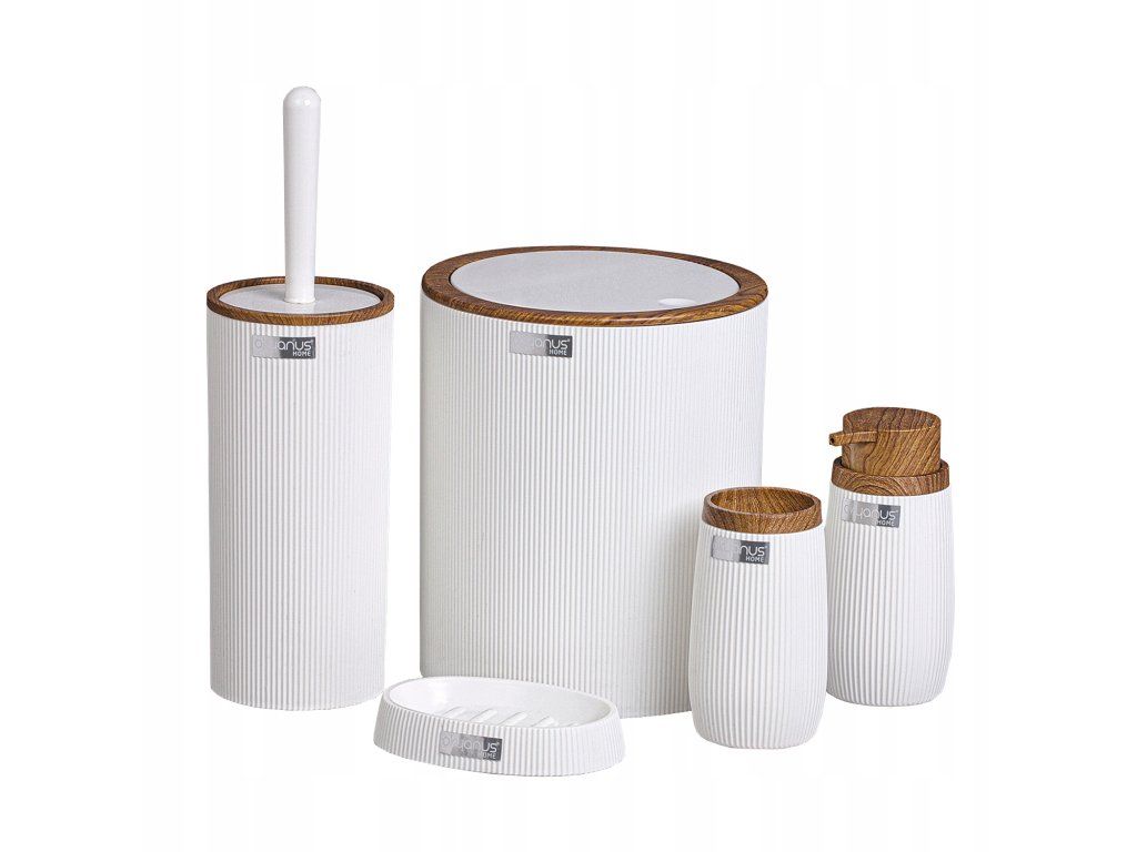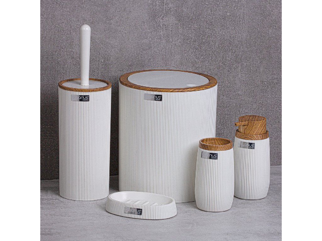 Set de baie 5 piese rotund de culoare albă cu un finisaj care imită lemnul, fabricat din plastic.Setul conține: