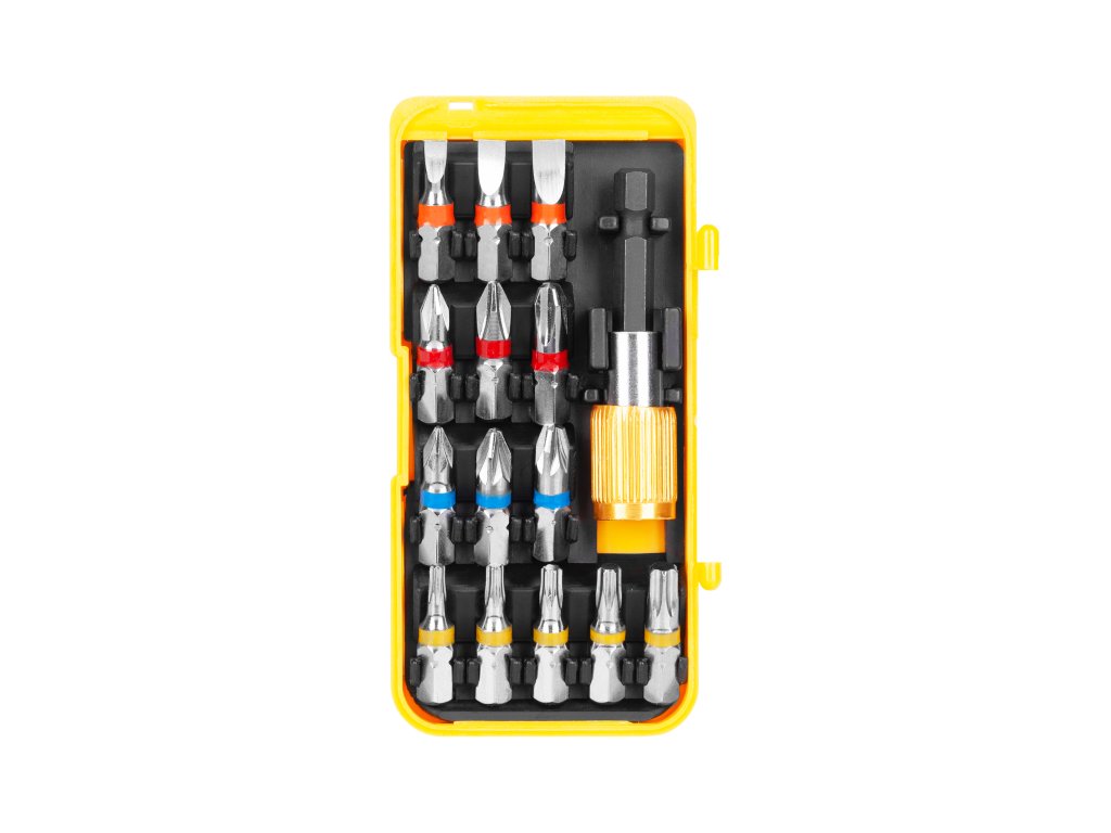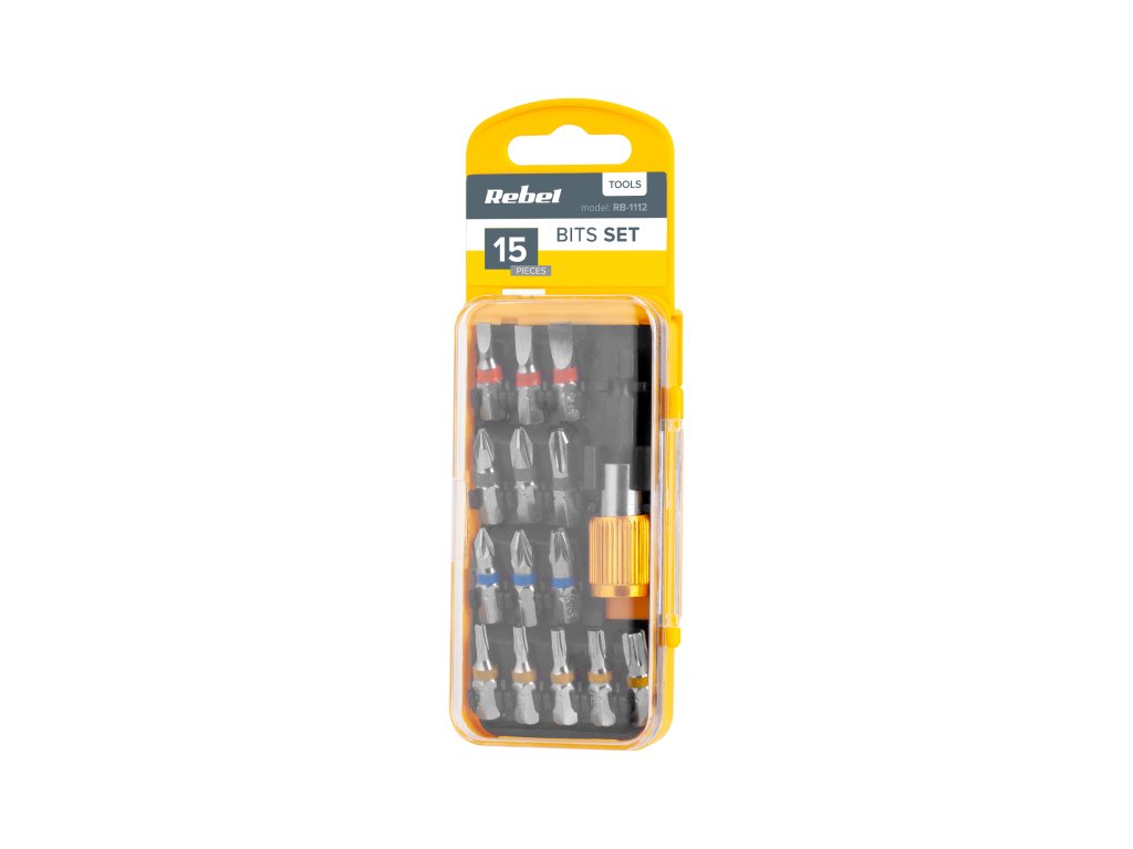 Set de biți cu adaptoare magnetice din seria Rebel Tools, util în atelierul fiecărui meșter. Mânerul cu lungimea de 60 mm permite o instalare ușoară în orice șurubelniță. Setul include și 14 biți din oțel crom-vanadiu, care sunt diferiți ca culoare pentru o identificare mai ușoară. Suportul magnetic puternic facilitează instalarea biților și asigură o muncă stabilă și confortabilă.