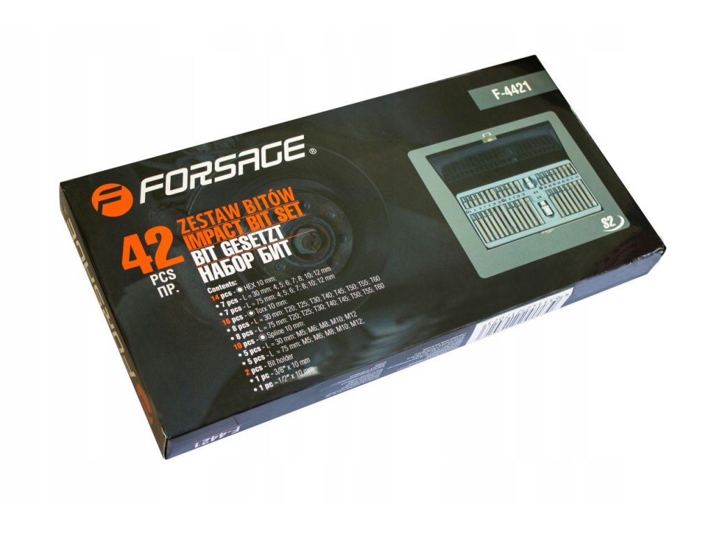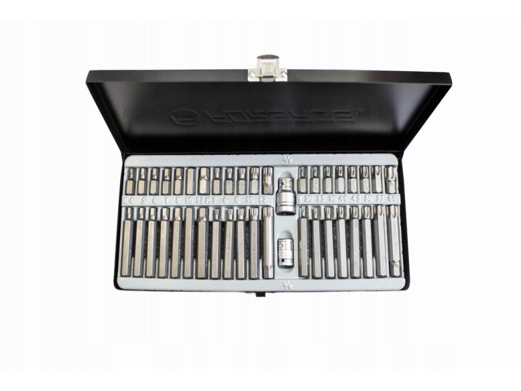 Set profesionist de biți, destinat desfacerea șuruburilor speciale de tip: hex, torx, spline. Diversitatea biților asigură posibilitatea realizării multor lucrări în service-uri mecanice și auto specializate. Biți fabricați din cea mai bună calitate a oțelului pentru unelte aliat S2, care se caracterizează printr-o duritate ridicată HRC 58-62, o structură uniformă și fină a materialului, rezistență la torsiune, un moment de strângere ridicat - 21,8 Nm, precum și un tratament termic excelent. Setul este ambalat într-o geantă din plastic pentru transport și depozitare.