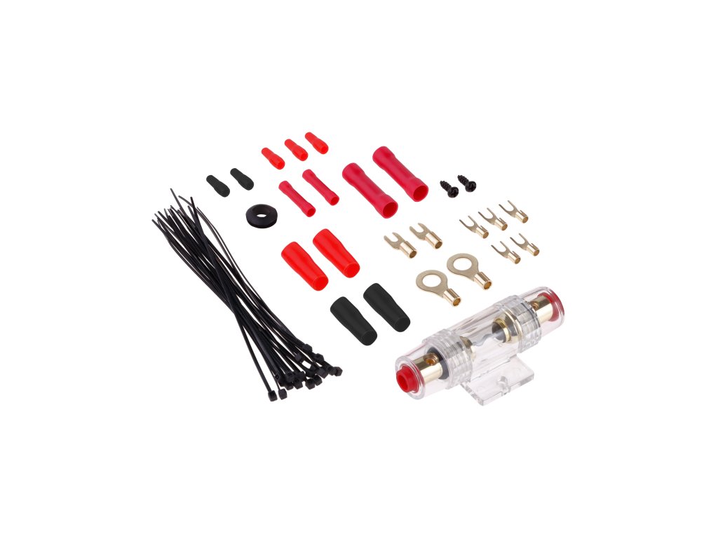 Conectarea amplificatorului la mașină necesită câteva accesorii suplimentare, așa că, pe lângă câteva cabluri - de alimentare, pentru difuzor, RCA și cablu de control - setul Kruger&Matz include de asemenea: un suport de siguranțe cu siguranță de 60A și un peszel, care va asigura siguranța cablurilor protejându-le de murdărie sau umezeală. Din set nu putea lipsi nici accesoriile de montaj - tot ce vă va ușura conectarea amplificatorului de unul singur. Extindeți-vă sistemul audio în mașină și porniți la drum.