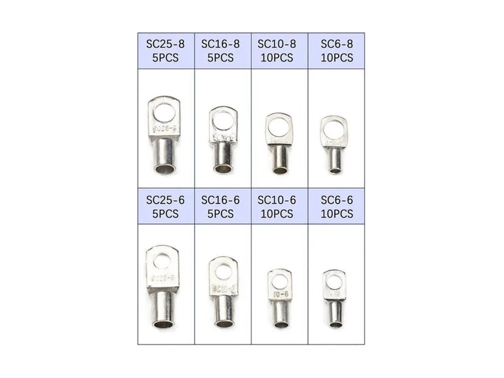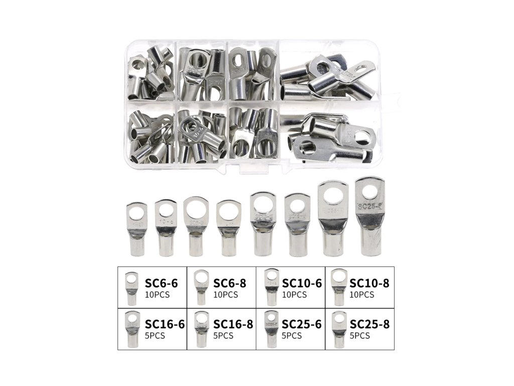Set de 60 capete terminale pentru cablu Produs din cupru staniu de cea mai înaltă calitate, ecologic, sigur de utilizat Diverse terminale comprimate ambalate într-o carcasă practică cu compartimente Specificații: material: cupru staniu culoare: argintiu cantitate: 60 bucăți / 1 set Ambalajul conține: 5 bucăți x terminal SC25-8 (lățimea deschiderii pentru conductor 7mm, deschidere pentru șurub 8,5mm) 5 bucăți x terminal SC25-6 (lățimea deschiderii pentru conductor 7mm, deschidere pentru șurub 6,5mm) 5 bucăți x terminal SC16-8 (lățimea deschiderii pentru conductor 6mm, deschidere pentru șurub 8,5mm) 5 bucăți x terminal SC16-6 (lățimea deschiderii pentru conductor 6mm, deschidere pentru șurub 6,5mm) 10 bucăți x terminal SC10-8 (lățimea deschiderii pentru conductor 5,4mm, deschidere pentru șurub 8,5mm) 10 bucăți x terminal SC10-6 (lățimea deschiderii pentru conductor 5,4mm, deschidere pentru șurub 6,5mm) 10 bucăți x terminal SC6-8 (lățimea deschiderii pentru conductor 4,1mm, deschidere pentru șurub 8,5mm) 10 bucăți x terminal SC6-6 (lățimea deschiderii pentru conductor 4,1mm, deschidere pentru șurub 6,5mm)Set de 60 capete terminale pentru cablu