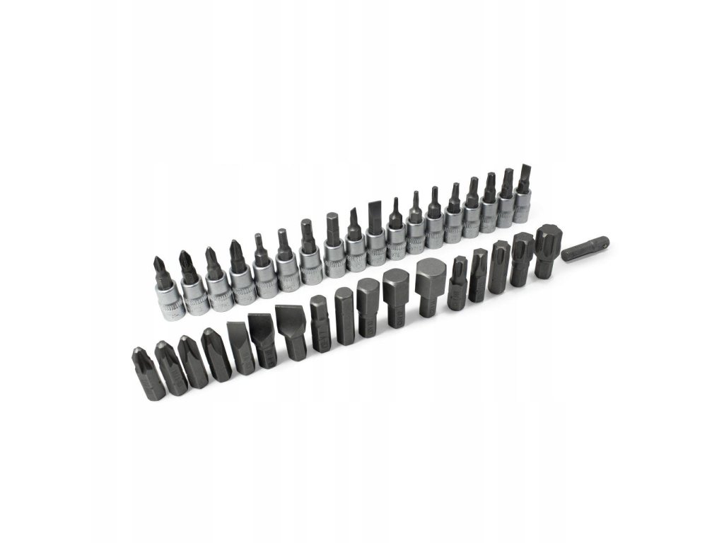 - Prize biți - 17 pcs.: FD 8, 10, 12; T 40, 45, 50, 55, 60; PH 3, 4; PZ 3, 4; HEX 7, 8, 10, 12, 14