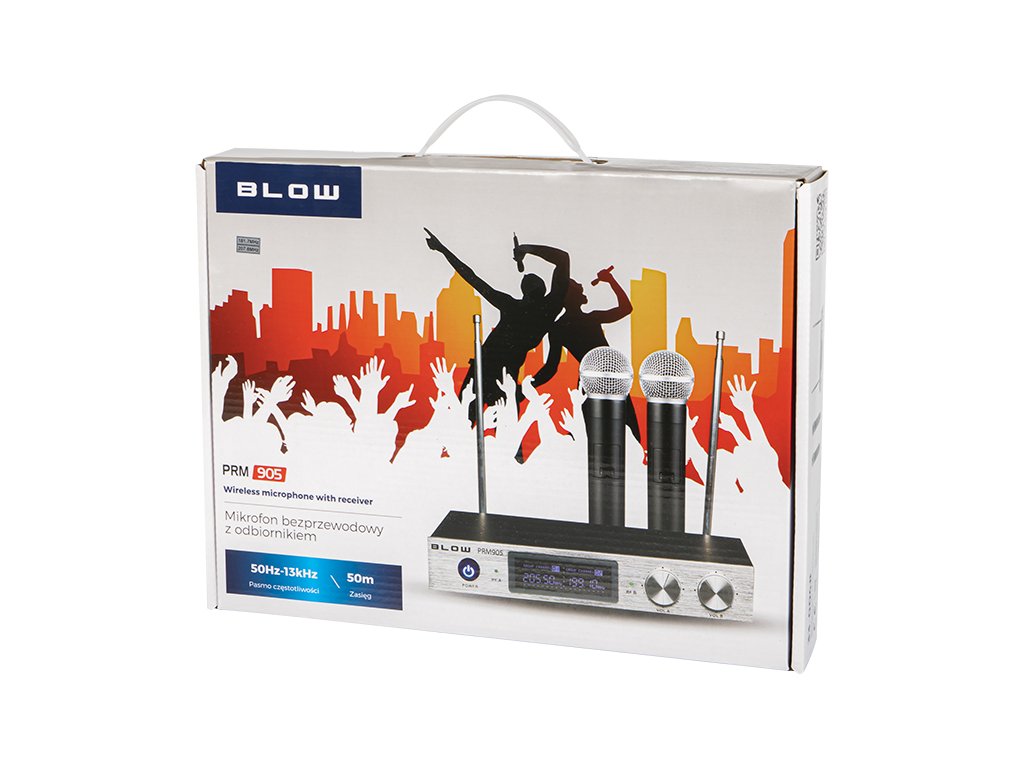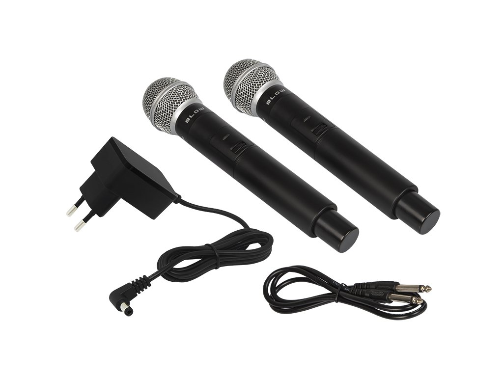 Set profesional de înaltă calitate, compus din două microfoane wireless și un receptor de la compania Blow, destinat atât utilizării profesionale, cât și amatorilor. Conectarea și utilizarea nu ar trebui să fie o problemă. Distanța maximă între receptor și microfon este de 50 de metri.