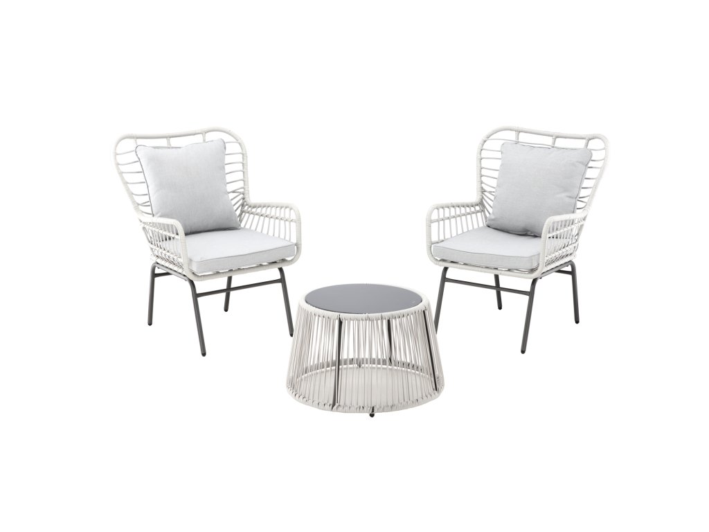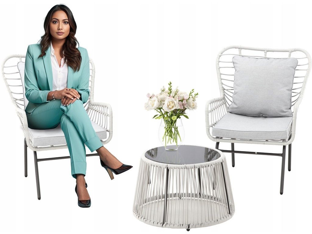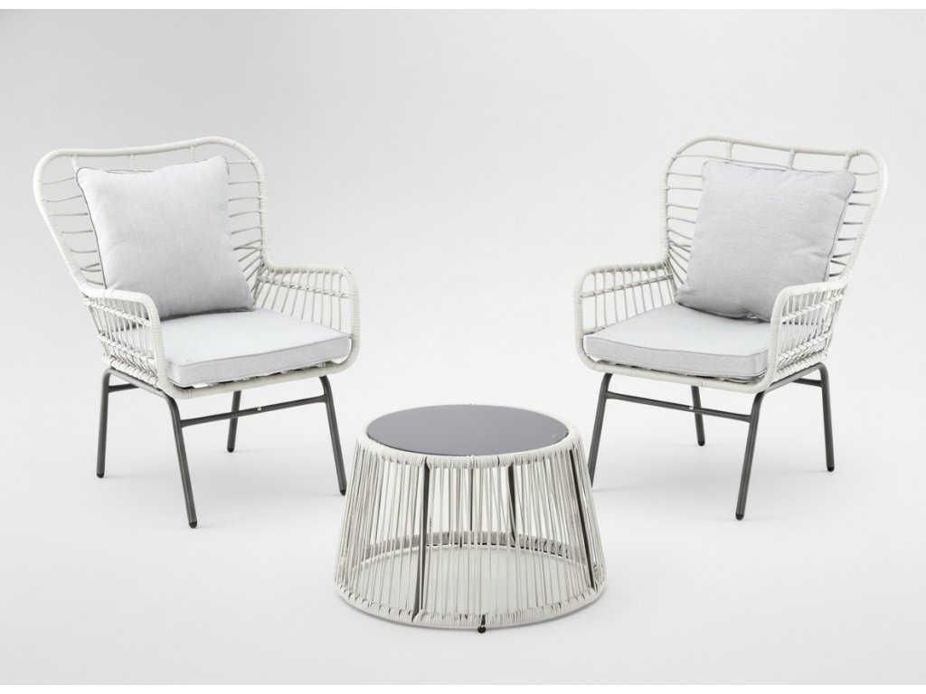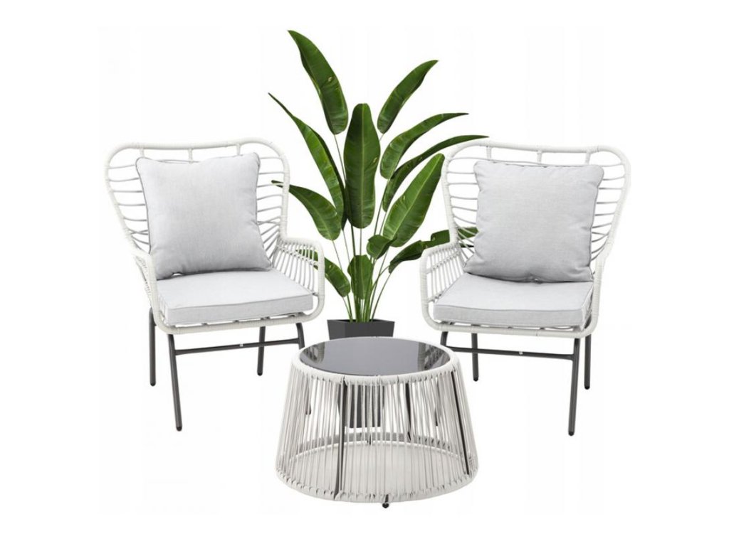 Set modern de mobilier de grădină cu un design minimalist, care se potrivește perfect în orice spațiu. Combinația elegantă a cadrului alb cu pernele gri aduce eleganță și un caracter modern. Ideal pentru relaxare zilnică, întâlniri la cafea sau o cină romantică sub cerul liber.