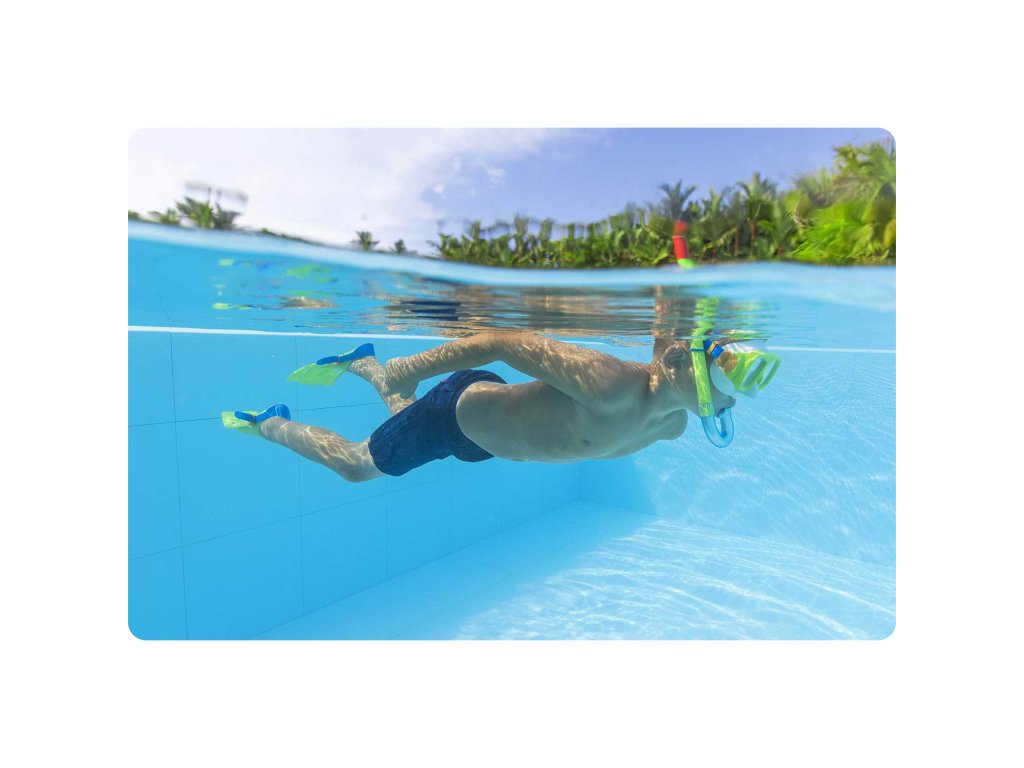 Snorkelul inclus este echipat cu o supapă specială care facilitează evacuarea apei din snorkel.