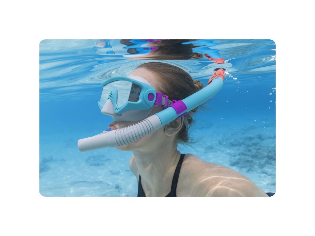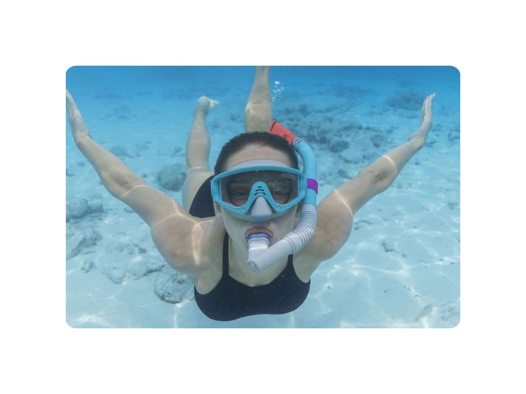 Acum poți să te scufunzi și să te bucuri de distracțiile acvatice pe săturate! Masca de înot, care este parte a setului, include lentile din policarbonat