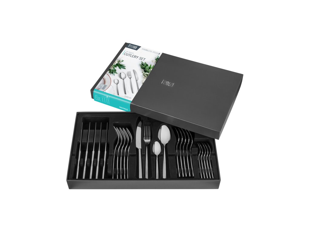 Acest set de 24 de piese conține cuțite, furculițe, linguri și lingurițe de ceai perfect lustruite - tot ce aveți nevoie pentru o primire aproape regală.