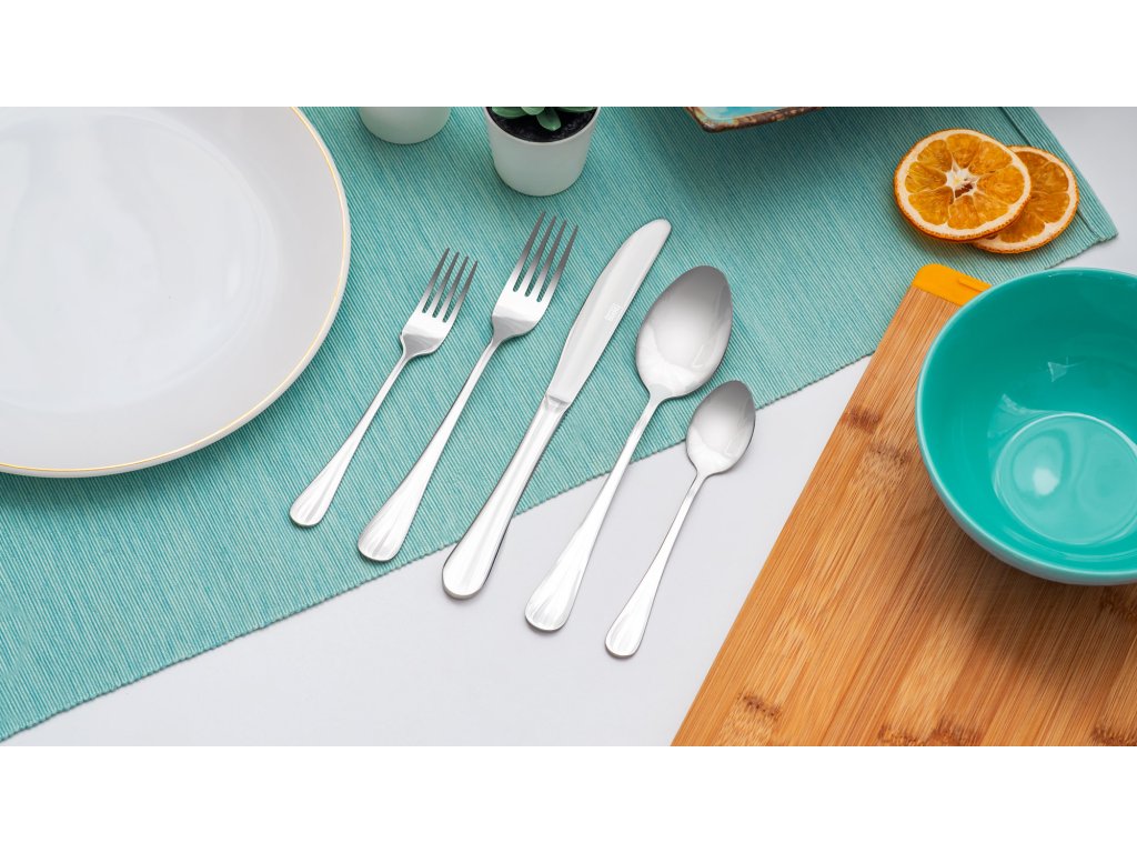 Setul include linguri de supă, furculițe, cuțite, linguri și furculițe pentru tort. Designul fin, accentuat de marginile rotunjite, face ca tacâmurile să se potrivească perfect cu orice tip de veselă. Confortul ridicat de utilizare este asigurat nu numai de echilibrul perfect al fiecărui element, ci și de prelucrarea solidă și curățarea ușoară.