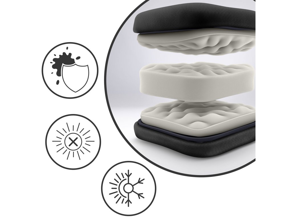 - și acoperită cu un material textil plăcut la atingere. Ușor de curățat, rezistent la UV și diferențe de temperatură.