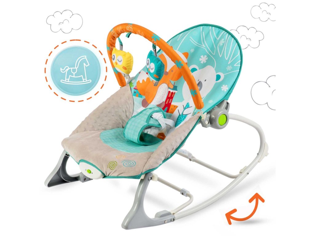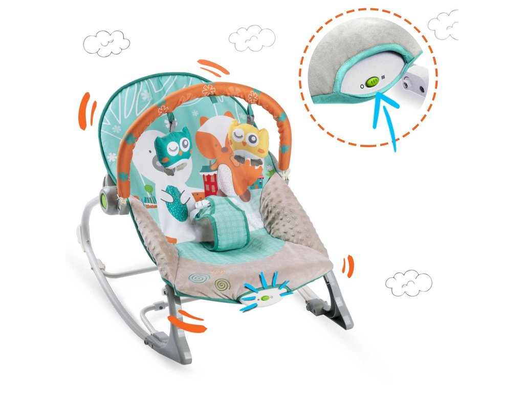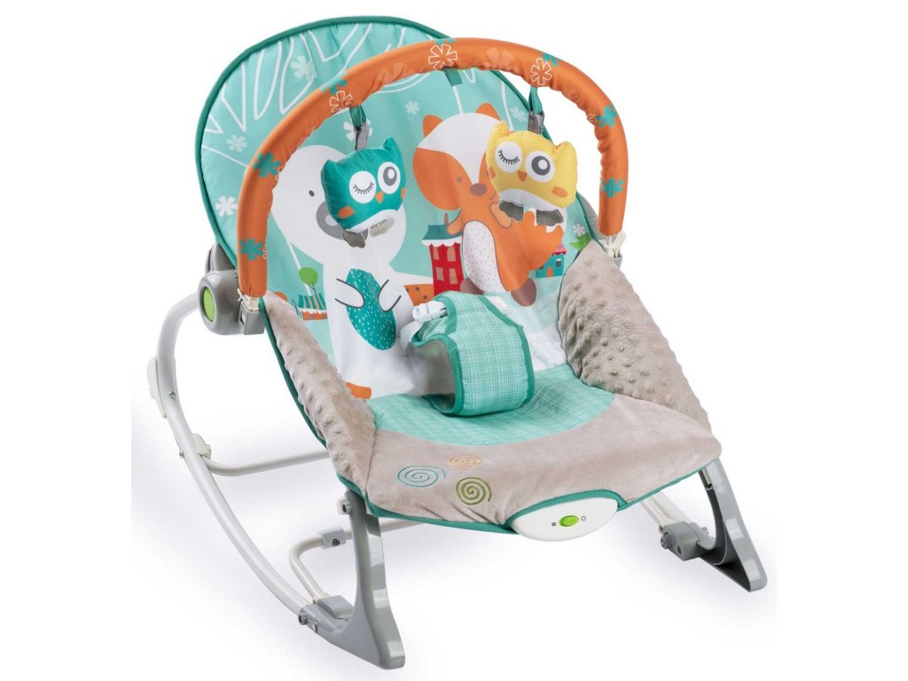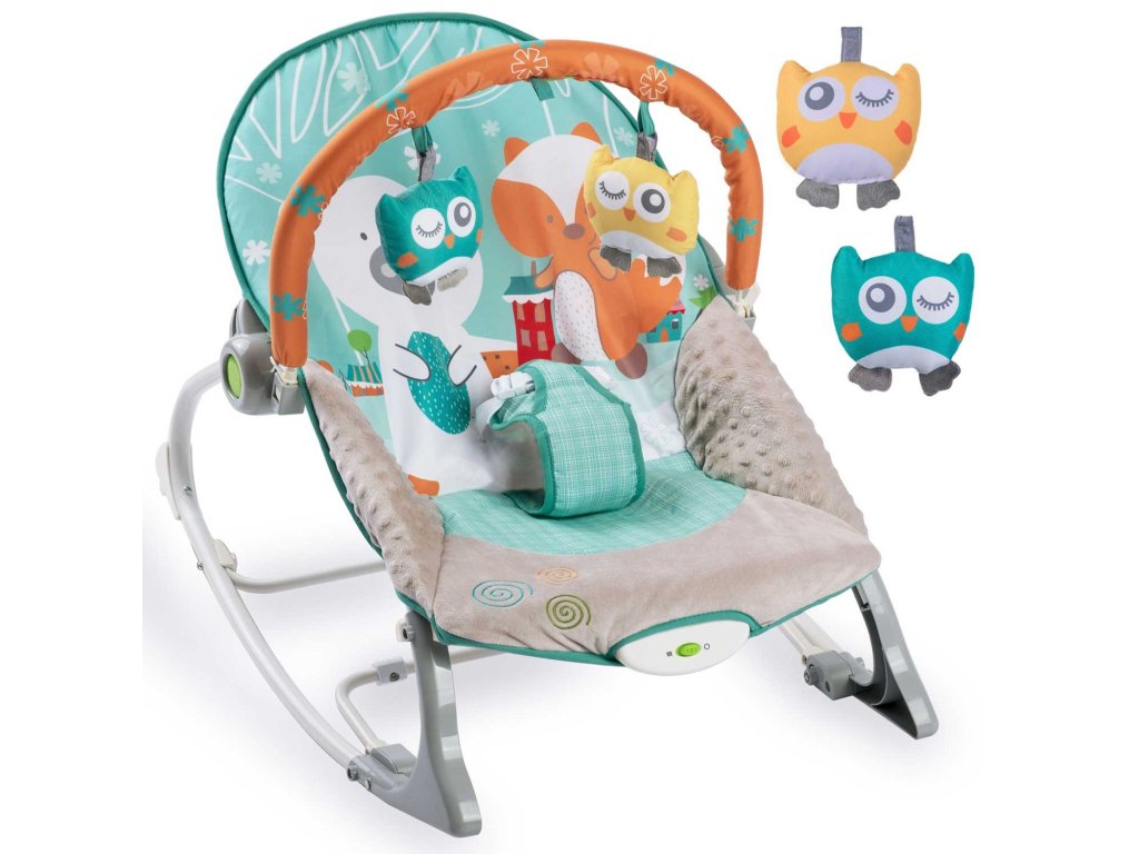 Șezlongul pentru bebeluși este echipat cu o bandă detașabilă cu jucării foșnitoare - o bufniță și un lup și o zornăitoare. Acestea îți vor distra copilul în timp ce tu te poți relaxa. Aceste unice jucării stimulează vederea și dezvoltă senzul tactil.