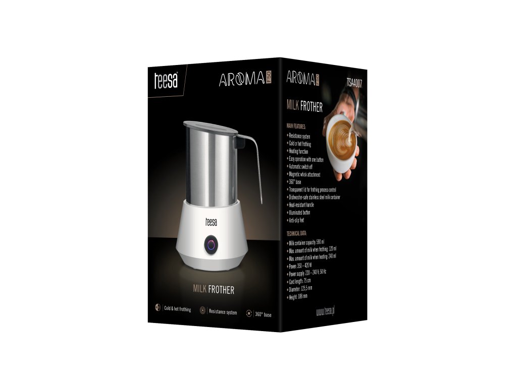 Lăsați-l să vă ajute să începeți bine fiecare dimineață. Și nimic nu îmbunătățește dispoziția de dimineață precum o cafea delicioasă cu spumă fină. Mai ales când pregătirea ei durează doar câteva momente. Spumantorul de lapte Teesa AROMA F50 vă permite, cu ajutorul sistemului de inducție, să creați instantaneu o spumă perfectă de lapte care va face cafeaua voastră magică. În plus, datorită posibilității de a seta temperatura rece sau caldă, vă puteți bucura, după preferințe, de prepararea unui cappuccino sau a unei frappe reci, precum și de un cacao sau ciocolată delicioasă pentru cei dragi.