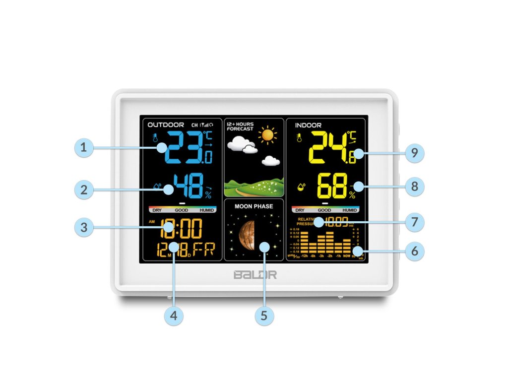 - Stația meteo măsoară continuu temperatura, presiunea și umiditatea, analizează și oferă prognoze meteo pentru următoarele 12-24 ore.