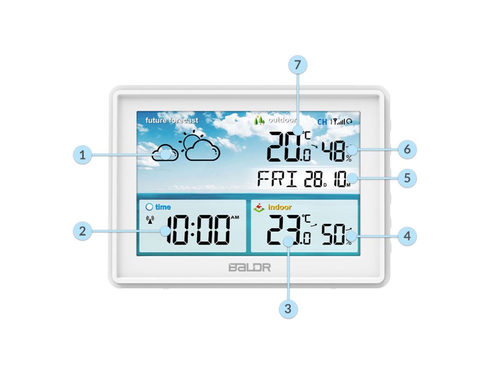 - Stația măsoară continuu temperatura, presiunea și umiditatea, analizează și oferă prognoze ale vremii pentru următoarele 12 ore.