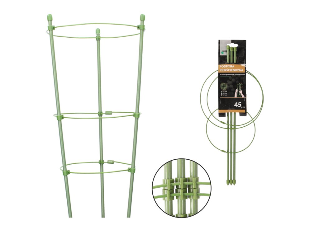 Suportul cu inele și stâlpi este o alegere excelentă pentru plantele de interior și straturile de flori. Datorită construcției metalice solidă și a acoperirii din plastic, este extrem de rezistent la daune și condiții meteorologice adverse, iar datorită culorii verzi devine aproape invizibil pe fundalul plantei. Potrivit, de exemplu, pentru cultivarea: afinelor, hortensiei. Previne "îndoirea" plantei și permite o creștere armonioasă. Suportul cu inele poate fi o alternativă interesantă la diferite tipuri de stâlpi individuali. Culoarea verde a produsului se potrivește perfect cu plantele și poate servi și ca decorație pentru grădină. Suportul trebuie plasat în pământ lângă plantă și fixat de tulpină, asigurând astfel o stabilizare excelentă și protecție împotriva rupere, chiar și în condiții de vânt.