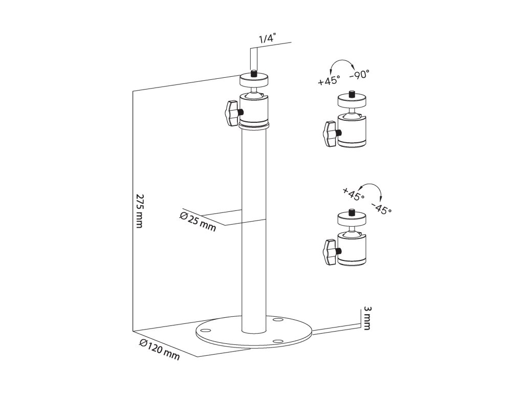 Suportul mobil pentru perete/tavan oferă o montare flexibilă cu o sarcină maximă de până la 2,5 kg. Datorită unghiurilor de rotație de la +90° la -45° și alinierii pe plan orizontal de la +45° la -45°, oferă o ajustare ideală a unghiului de vizualizare. Construcția solidă din oțel, cu un finisaj elegant negru mat și o distanță ajustabilă de la perete, asigură stabilitate și estetică. În plus, în pachet sunt incluse șuruburi de montare și dibluri, care facilitează o montare rapidă și solidă.