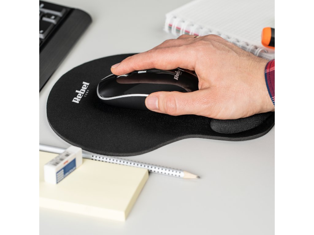 Munca îndelungată la calculator poate duce la oboseală și dureri ale încheieturii mâinii. Pentru a preveni această problemă, suportul pentru mouse Rebel a fost echipat cu un suport confortabil și moale care se adaptează formei mâinii tale, fiind astfel ideal pentru munca de birou. Suportul pentru mouse este acoperit cu un material textil negru și este compatibil cu toate tipurile de șoareci de calculator.