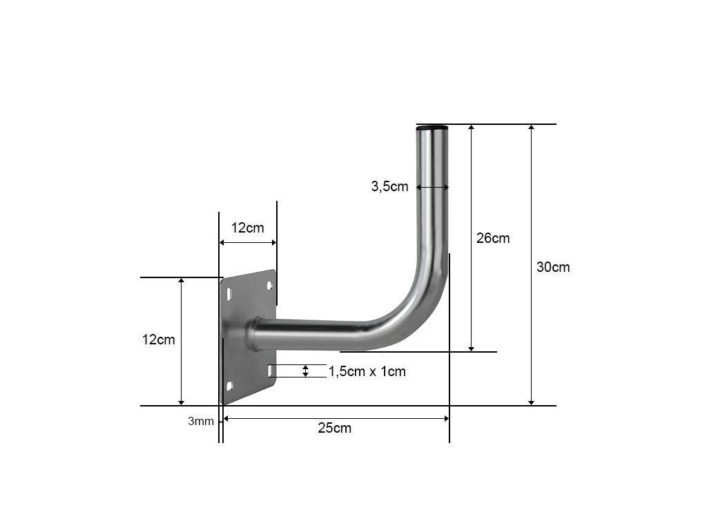 - Înălțime: 260 mm- Diametrul țevii: 35 mm- Lungimea brațului: 250 mm Lungimea brațului: 250 mm- Dimensiunea plăcii: 120x120 mm- Material: oțel, galvanizat- Greutate brută: 0,85 kg.