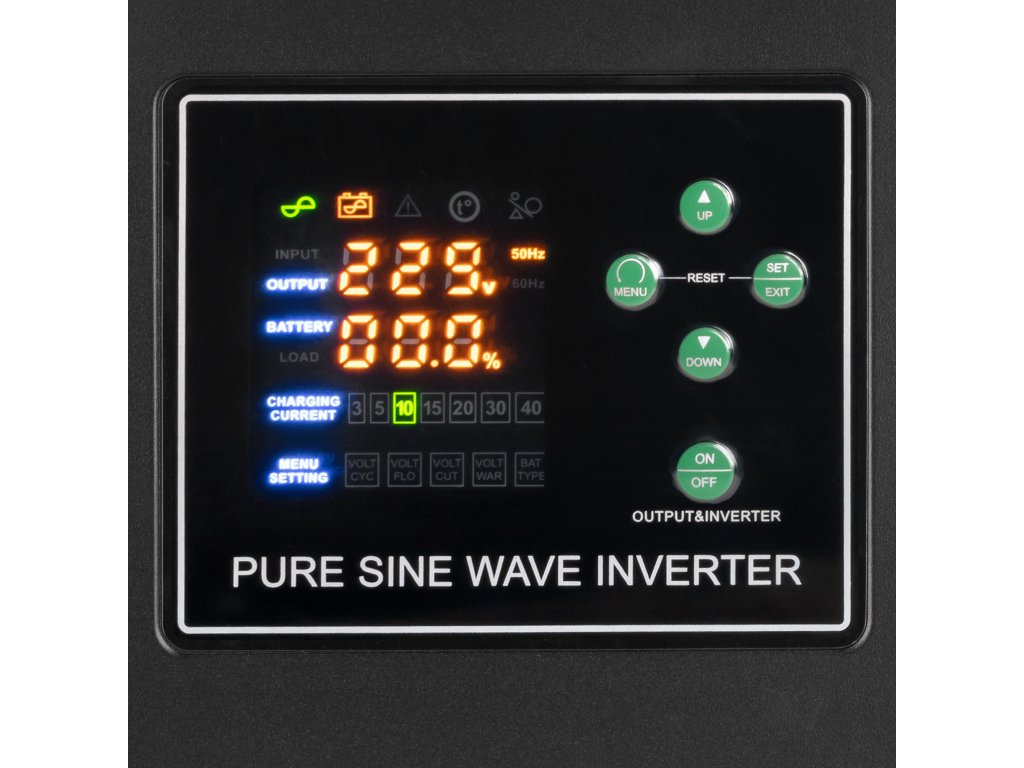 Utilizarea confortabilă a sursei de alimentare neîntreruptibilă Rebel este garantată de un afișaj LED clar. Datorită lui, poți citi cu ușurință statusul actual al funcționării dispozitivului, verificând, printre altele, nivelul tensiunii de intrare și ieșire și frecvența. În plus, vei verifica rapid și nivelul de încărcare și descărcare a bateriei.