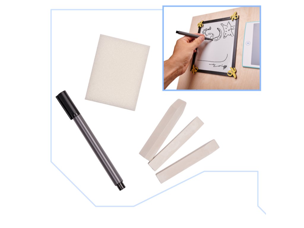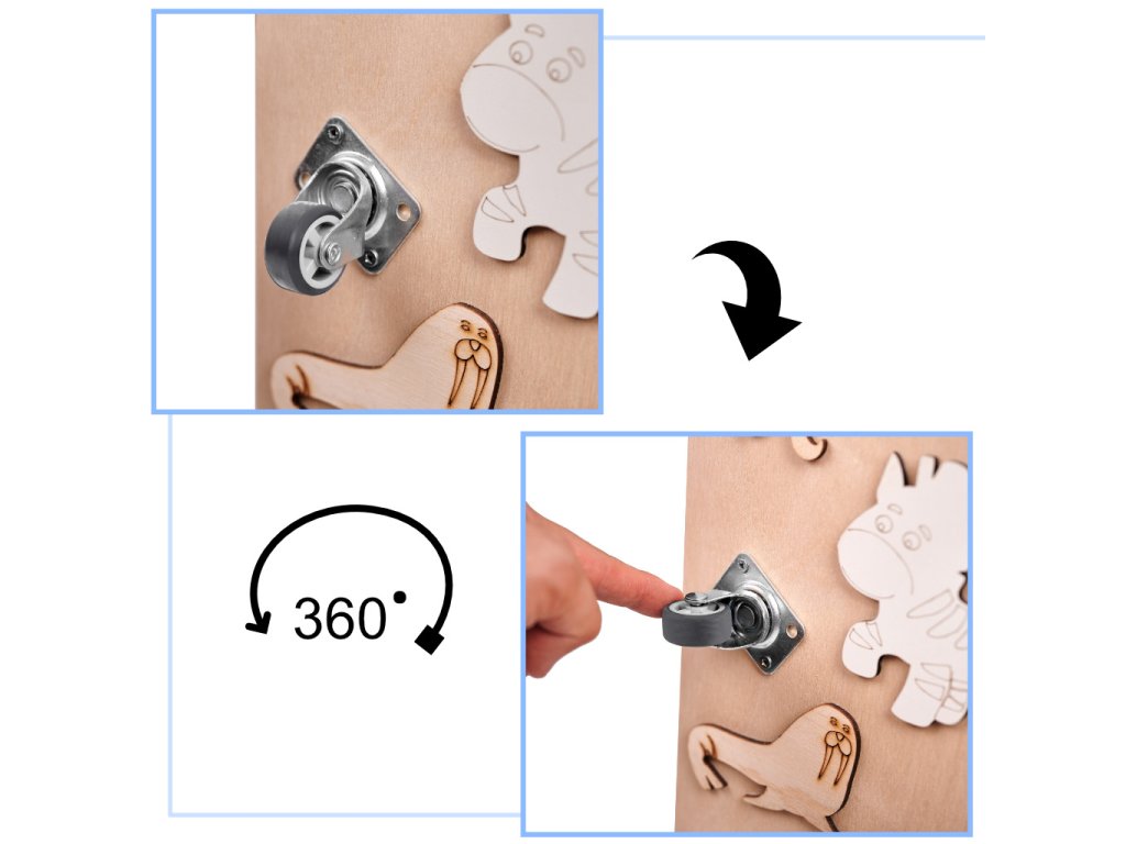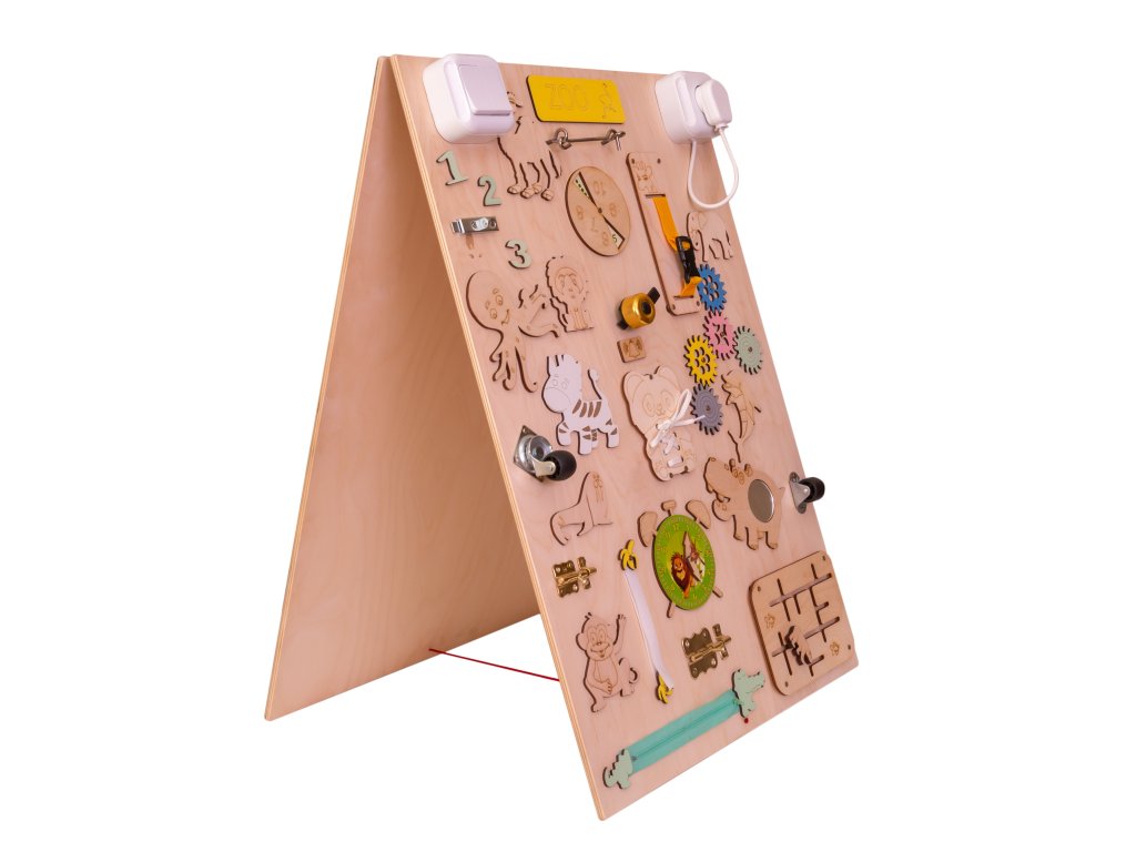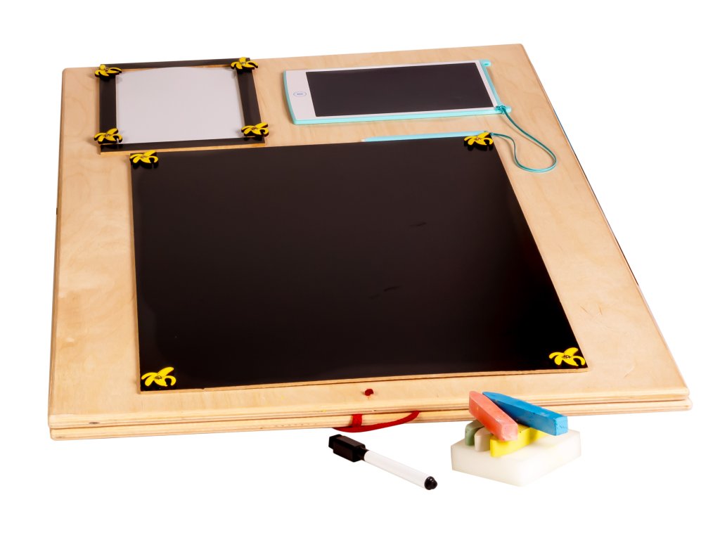 Totuși, această tablă este puțin diferită, pentru că este reversibilă! Pe o parte se află o tablă motrică tipică cu multe mecanisme, iar cealaltă parte este formată din trei tăblițe pe care se poate scrie cu cretă, markere lavabile și stilou!