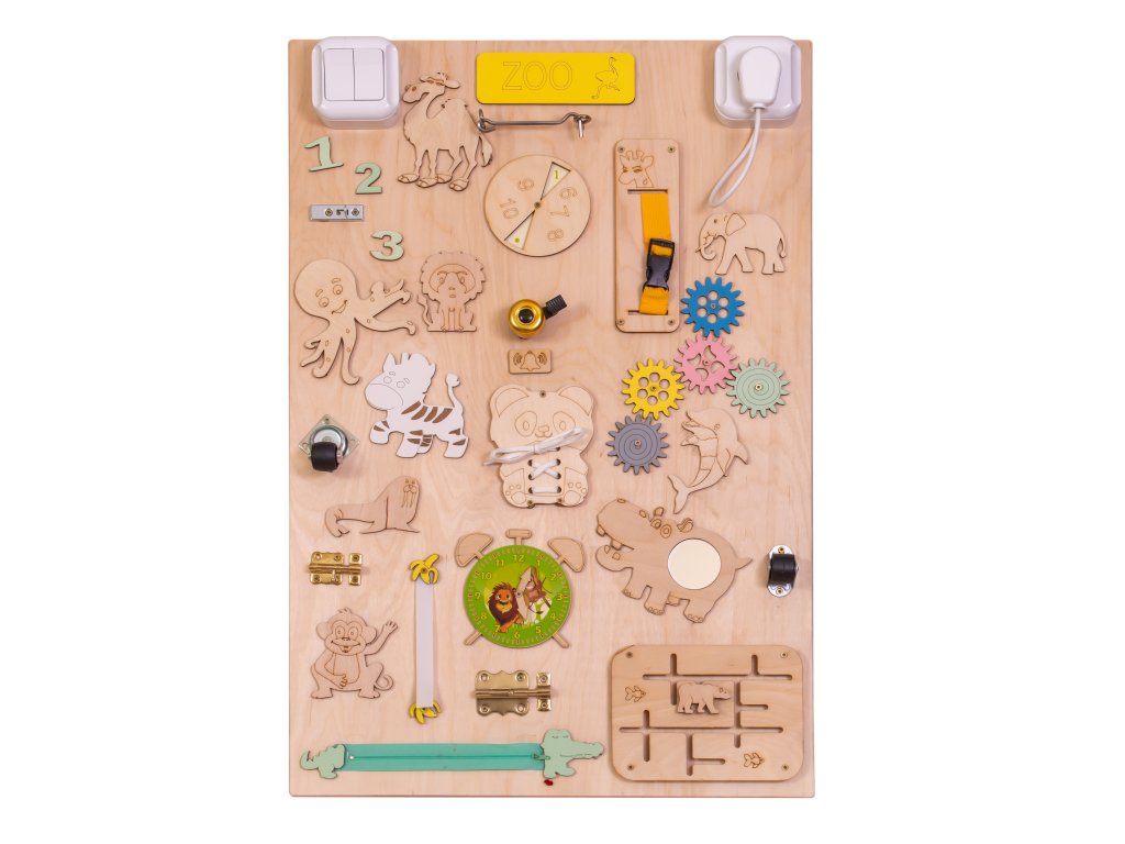 Tabla senzorială, cunoscută și sub denumirea de tablă motrică, este un dreptunghi, în acest caz din lemn, pe care sunt plasate diverse elemente. Scopul acestora este de a sprijini dezvoltarea copilului mic și de a-i oferi multă distracție fantastică!