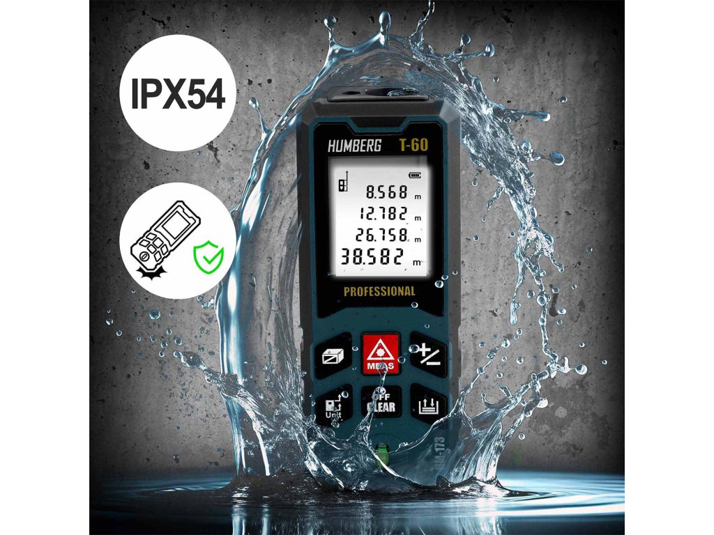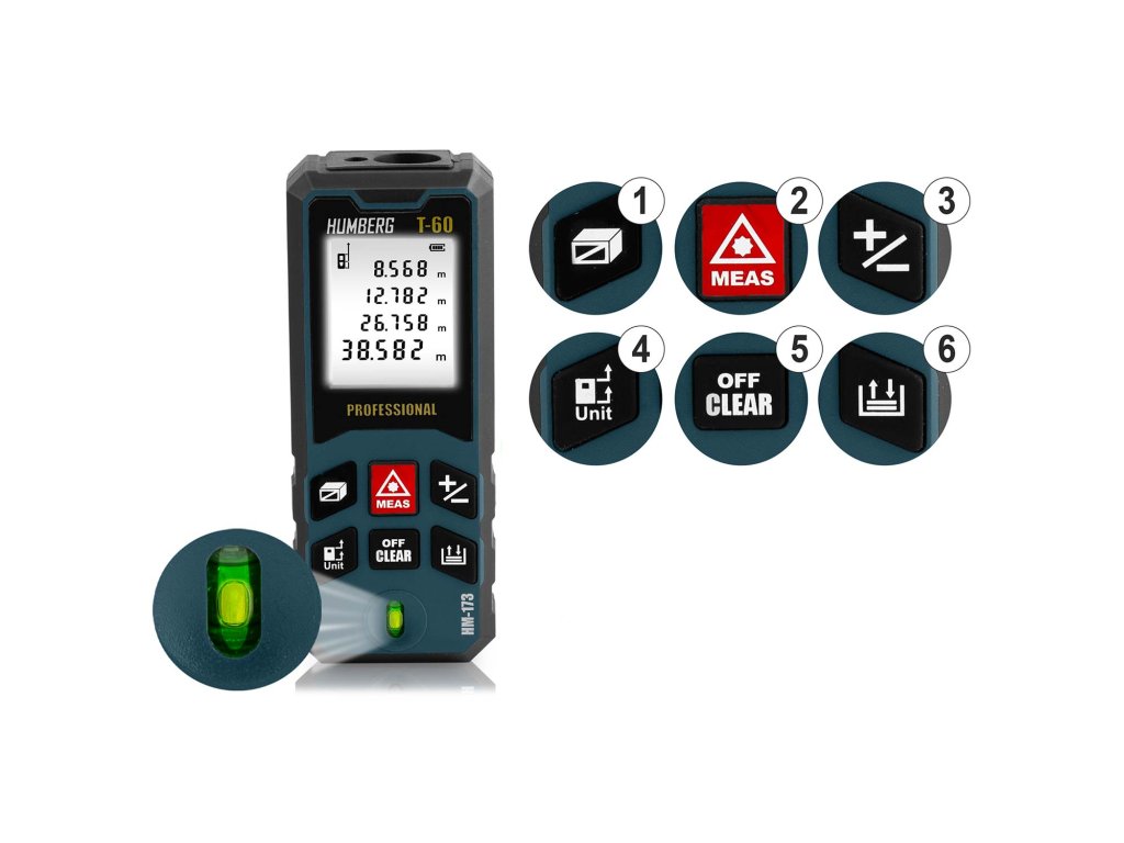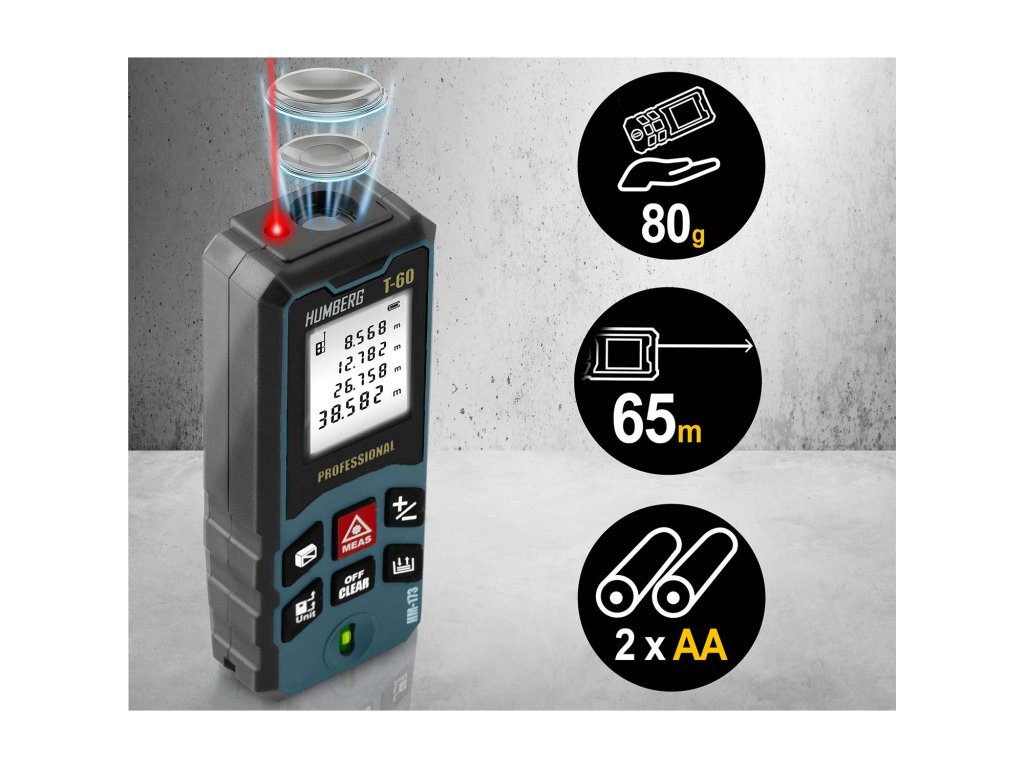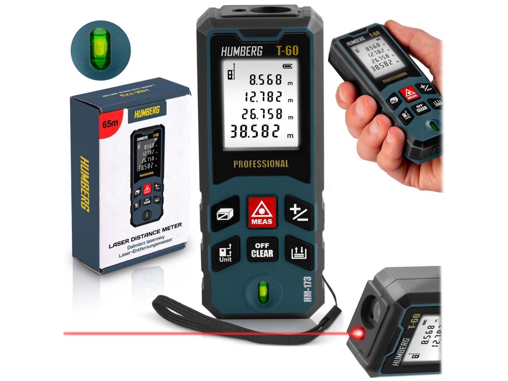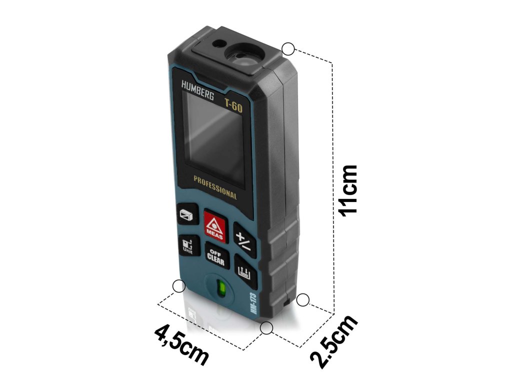 Telemetru laser HUMBERG T-60 permite măsurători de până la 65 de metri, echivalent cu lățimea întregului teren de fotbal! Datorită acestuia, ai posibilitatea măsurătorilor exacte la distanțe mari, atât la muncă, cât și pe teren.