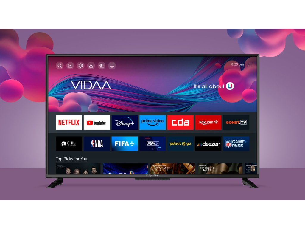 Televizorul inteligent Kruger&Matz KM0240FHD-V se distinge prin utilizarea VIDAA, unul dintre cele mai rapide și intuitive sisteme de operare pentru smart TV-uri. Grație acestui fapt, aveți acces la o gamă largă de funcții și divertisment imediat după pornirea televizorului Kruger&Matz.