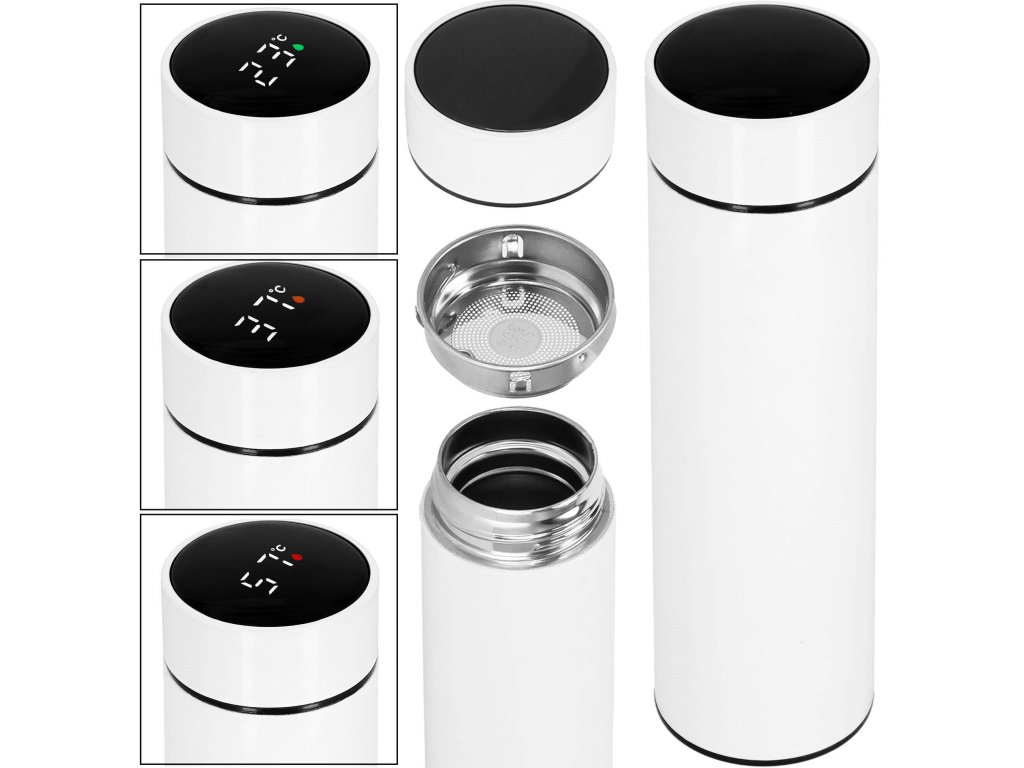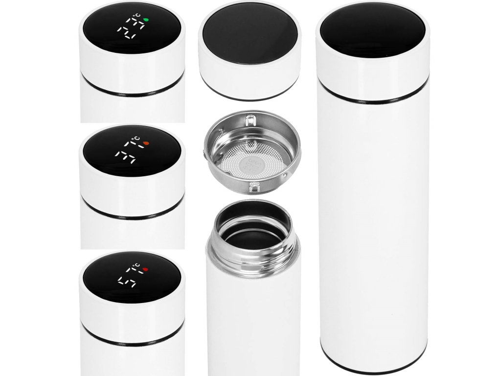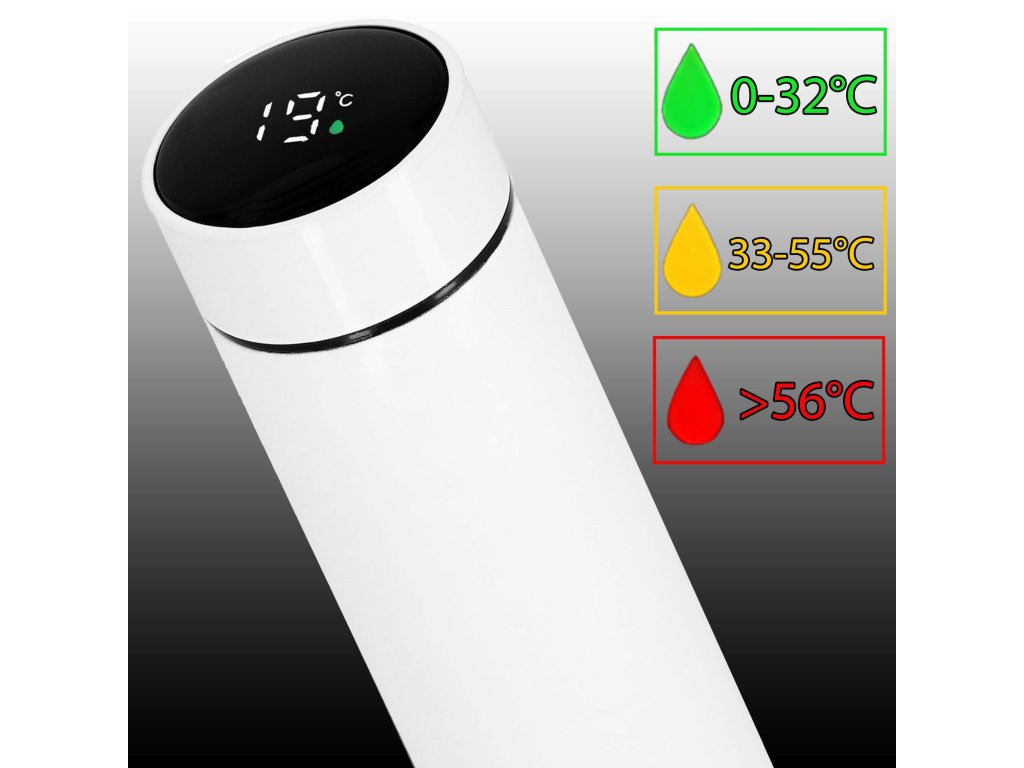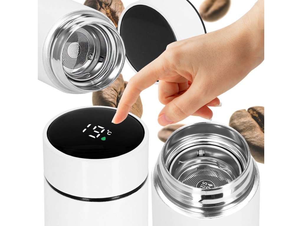- Afișaj electronic al temperaturii pe partea de sus a capacului, în grade Celsius, culoarea picăturii de pe afișaj indică nivelul de temperatură al băuturii: verde, portocalie, roșie