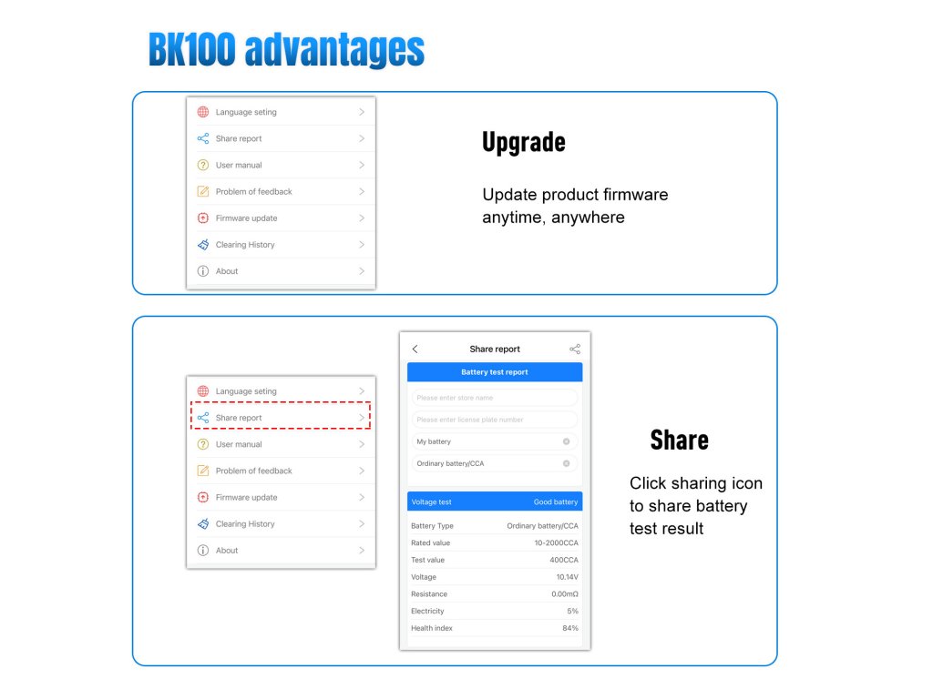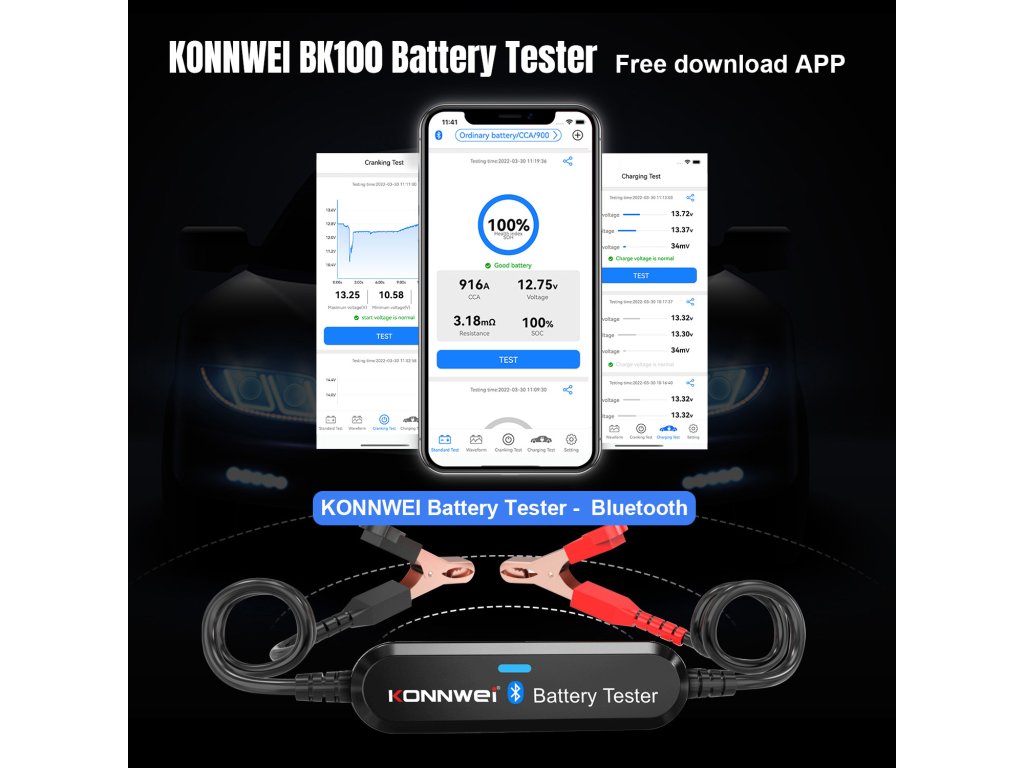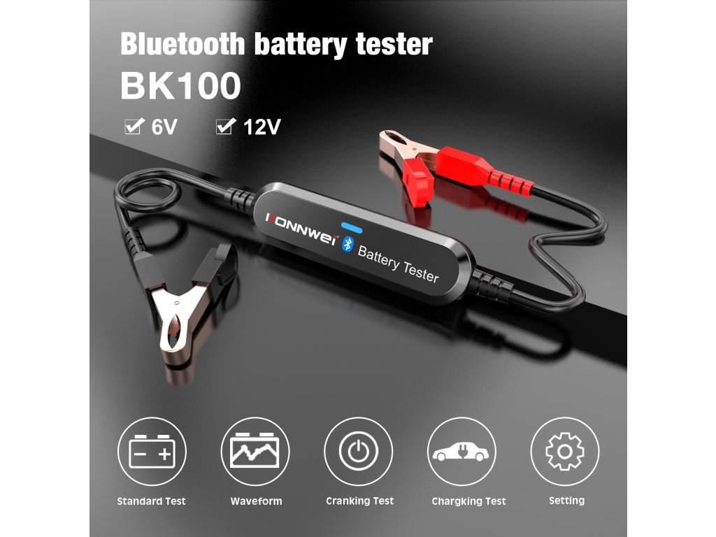 Îmbunătățiți controlul și siguranța mașinii dumneavoastră la un nivel superior. BK100 este un dispozitiv inovator pentru testarea bateriilor auto. Pentru a determina starea bateriei mașinii dumneavoastră, utilizează cea mai nouă tehnologie Bluetooth. Astfel, nu mai trebuie să stați în fața mașinii și să așteptați efectuarea testului. După conectarea bateriei la dispozitiv, deschideți aplicația pe telefon sau tabletă și realizați testul cu ușurință.