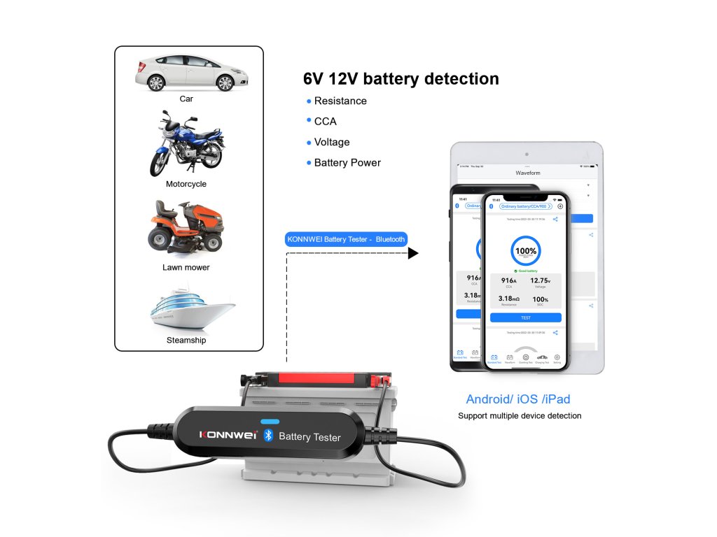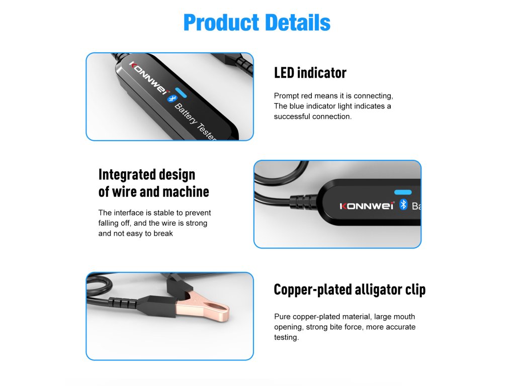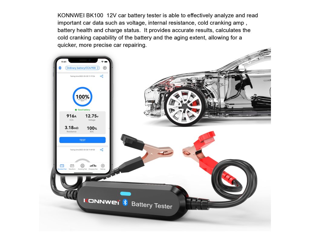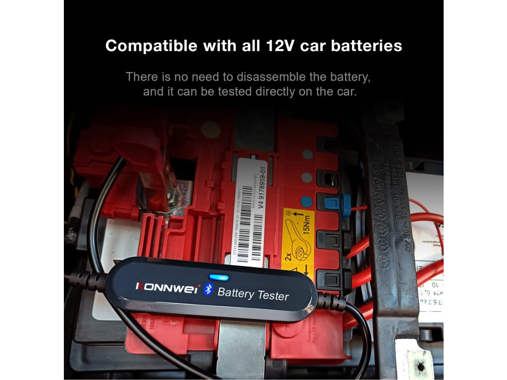 Testerul de baterii Konnwei Bluetooth oferă un confort neegalat și ușurință în utilizare. Nu mai este nevoie să stați în fața mașinii și să așteptați efectuarea testului. Doar conectați dispozitivul la baterie, deschideți aplicația și vizualizați raportul despre starea acesteia.