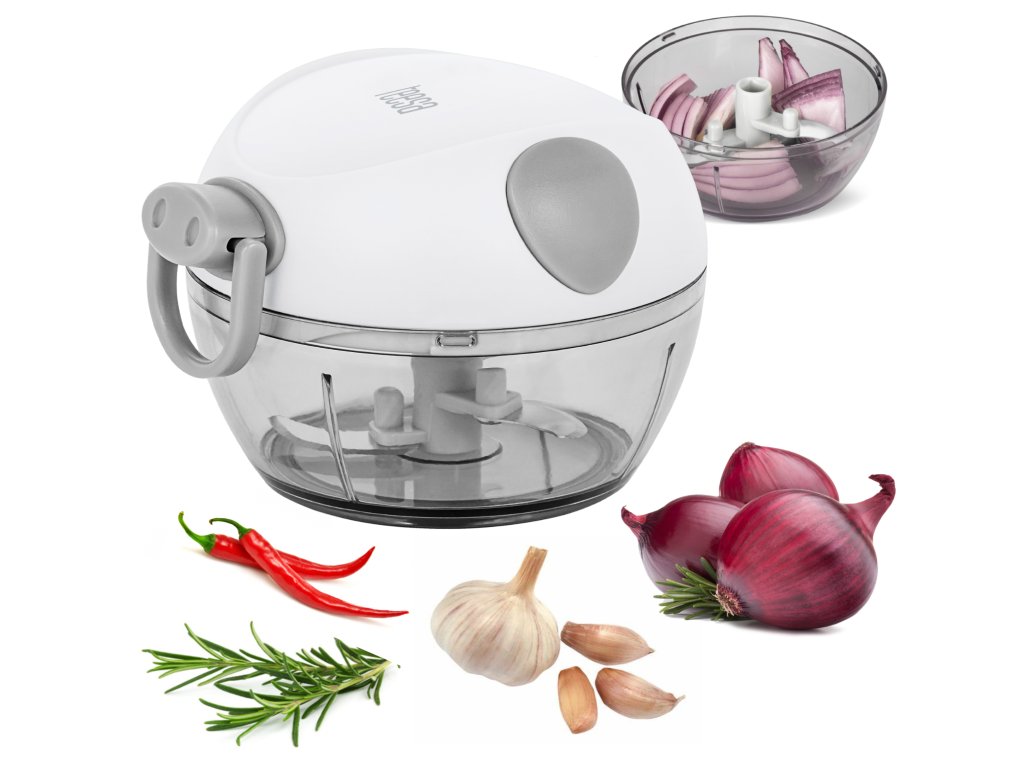 Aveți nevoie de un aparat mic care să vă ajute să preparați rapid salata preferată sau pasta de ouă  Sau vă pregătiți să mergeți cu cortul și aveți nevoie de un tocător de ceapă  Alegeți mini tocătorul manual de legume Teesa, cu un volum de 180 ml, care, cu ajutorul celor trei lame amplasate diferit, va toca cu ușurință ceapa, morcovii, nucile sau ierburile.
