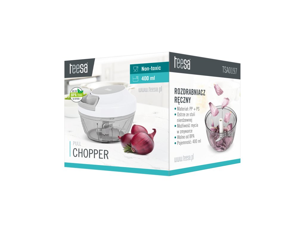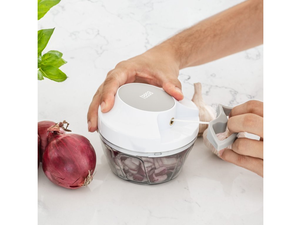 Folosește tocătorul Teesa oriunde dorești! Aparatul a fost conceput astfel încât să nu fii limitat de lungimea cablului de alimentare. Secretul funcționării rapide și eficiente este mecanismul cu șnur. Trebuie doar să tragi de câteva ori de șnurul care se retrage automat pentru a pune cuțitele în mișcare și toate ingredientele vor fi tăiate corect.