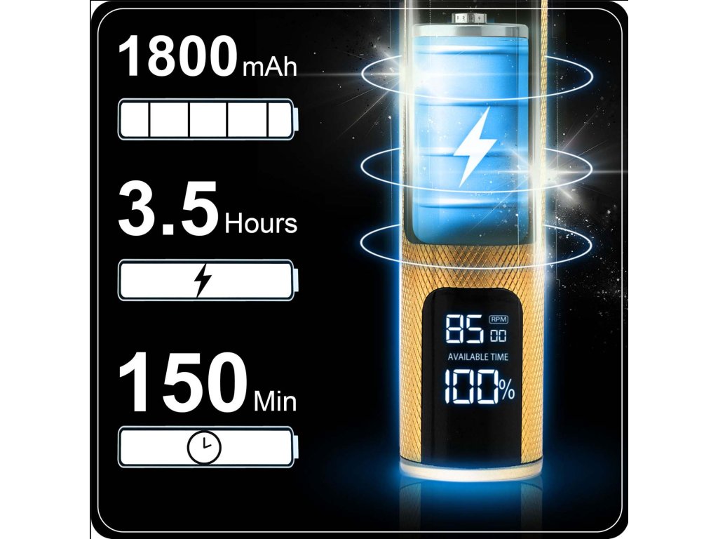 - Ecran LCD – afișează nivelul bateriei și viteza de rotație pentru un control complet.