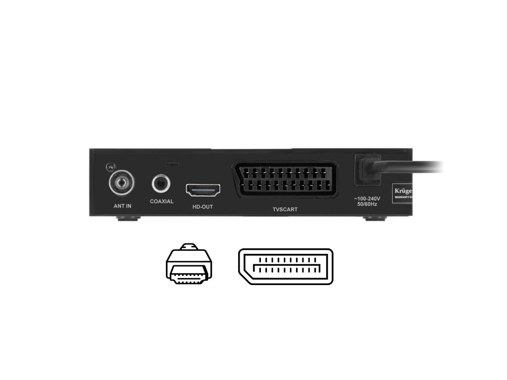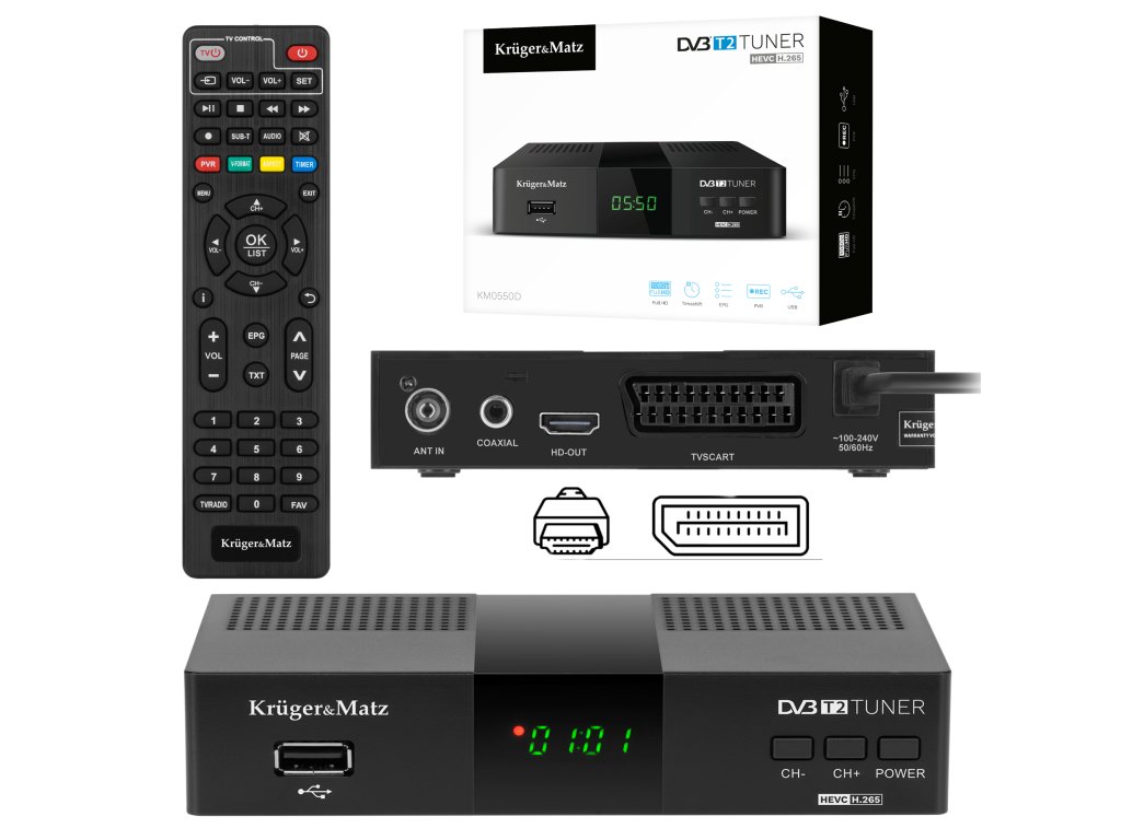 Tunerul Kruger&Matz KM0550D este echipat cu un conector HDMI, care permite conectarea la toate modelele mai noi de televizoare și vizionarea programelor în calitate FullHD. Dacă, însă, deții un model mai vechi de televizor, poți conecta fără probleme tunerul prin conectorul SCART, cunoscut obișnuit ca euroconector.